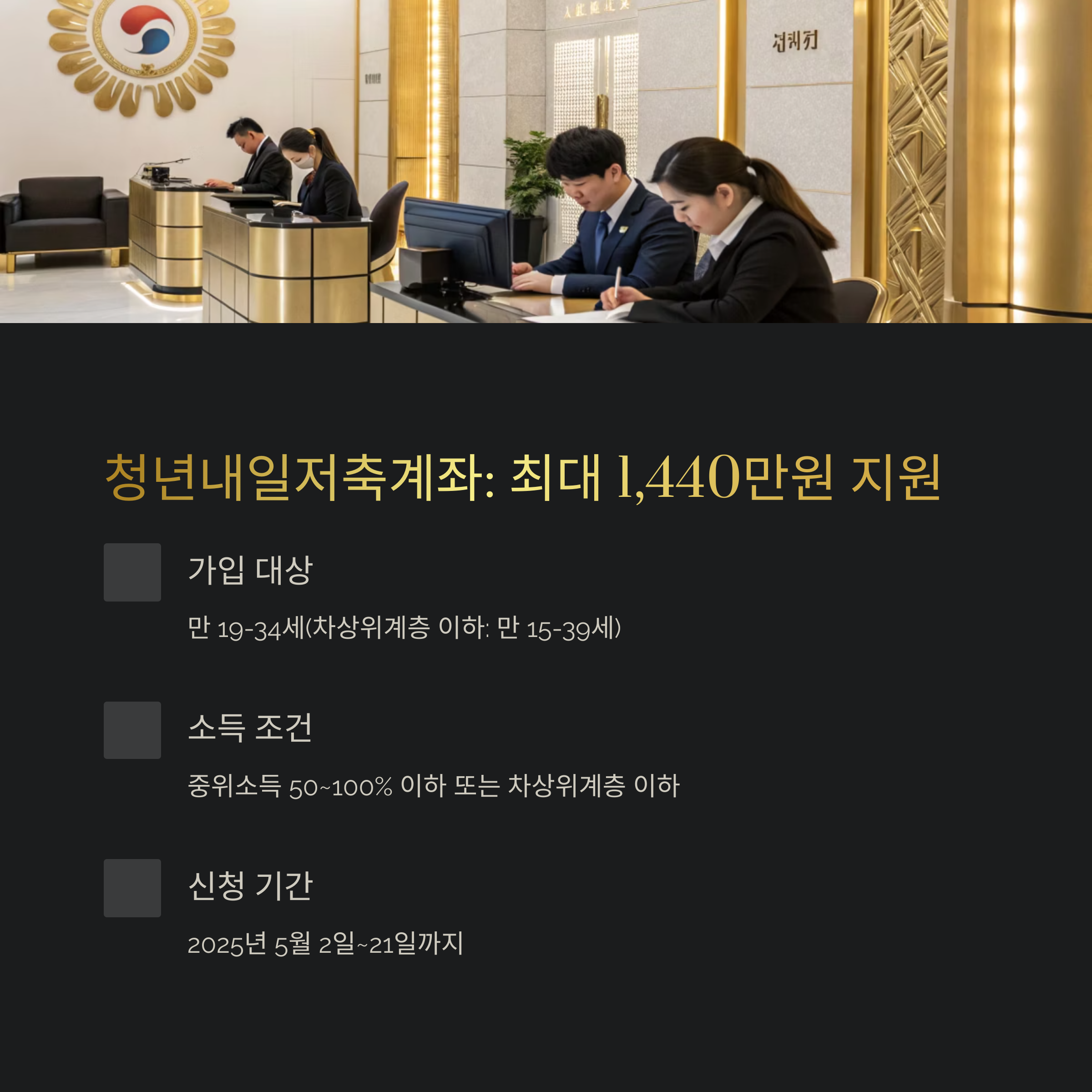 - 저소득 청년: 정부 ‘청년내일저축계좌’로 최대 1,440만 원 지급 가능