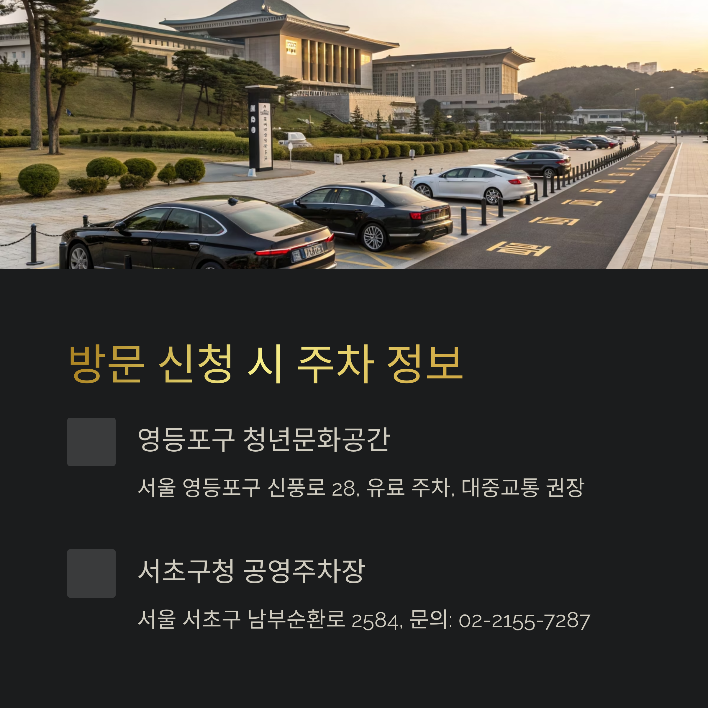 - 주소: 서울특별시 서초구 남부순환로 2584 (서초구청 본관)
