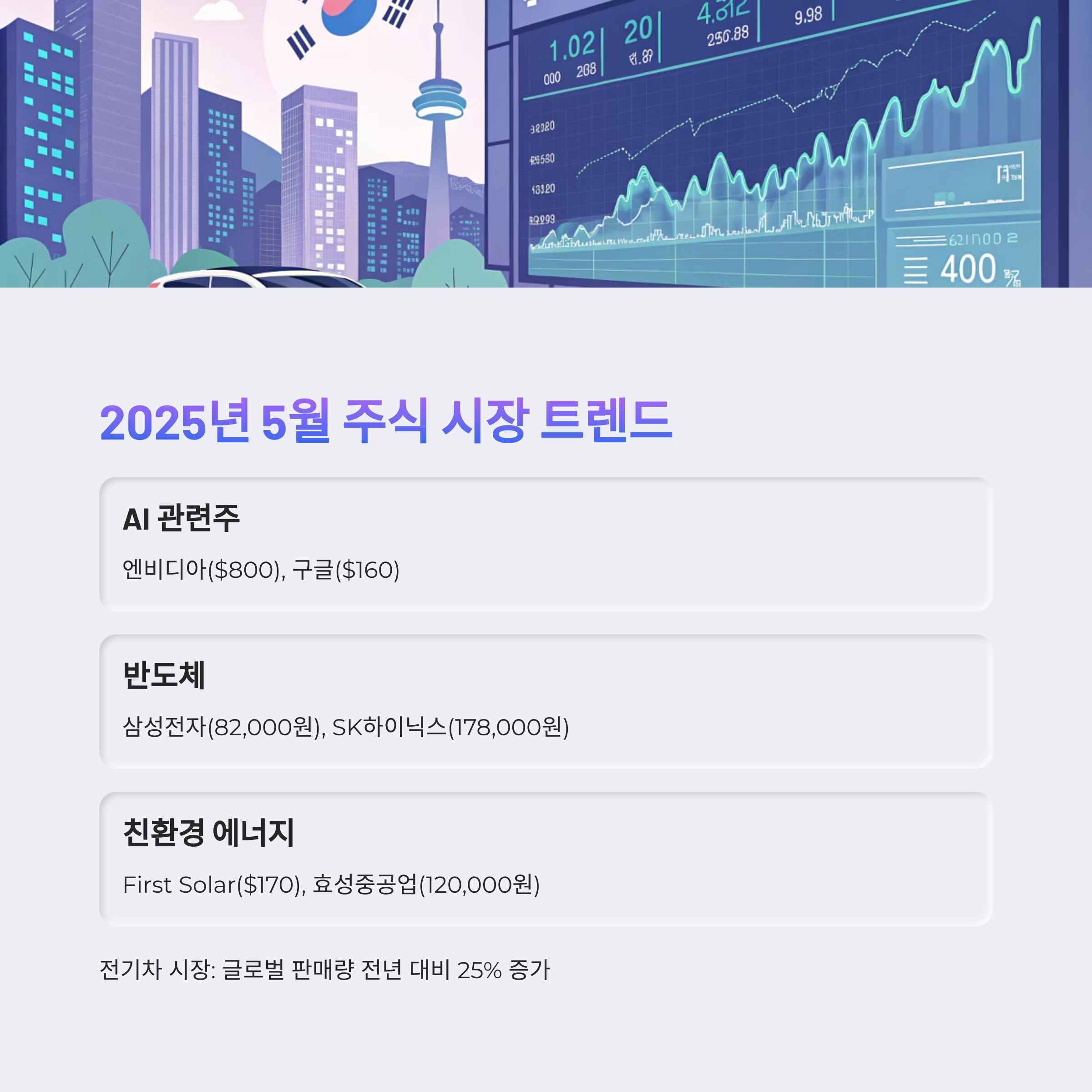 2025년 5월, 주식 시장은 AI, 반도체, 전기차, 친환경 에너지 등이 주도하고 있습니다.