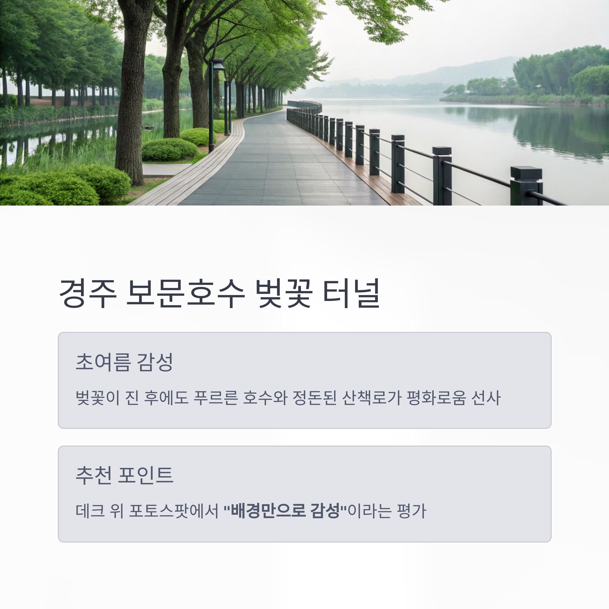 푸르른 보문호수와 정돈된 산책로는 누구에게나 평화로운 시간을 선물해 줍니다.