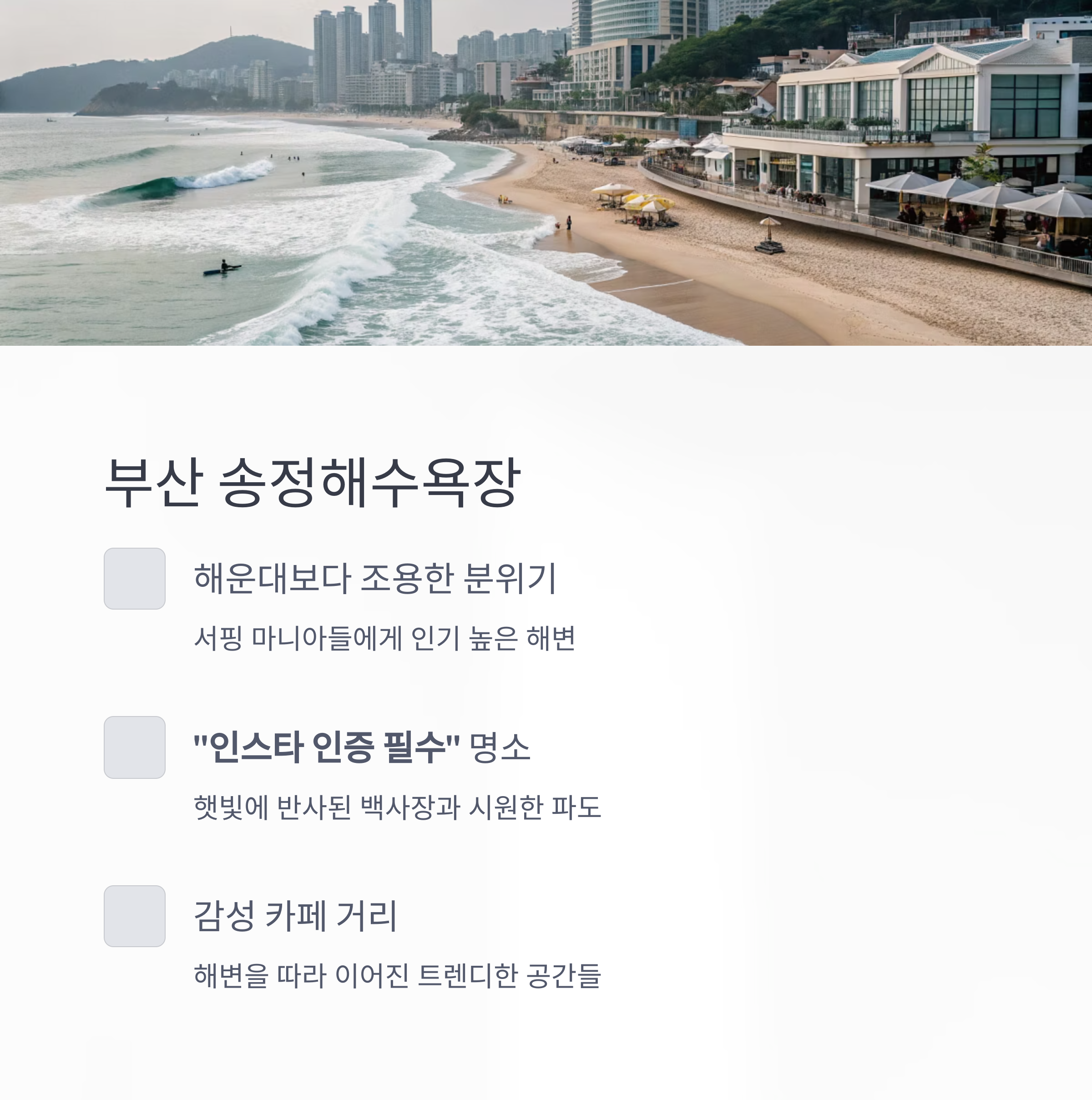 햇빛에 반사된 백사장과 시원한 파도, 그리고 해변을 따라 이어진 감성 카페들은