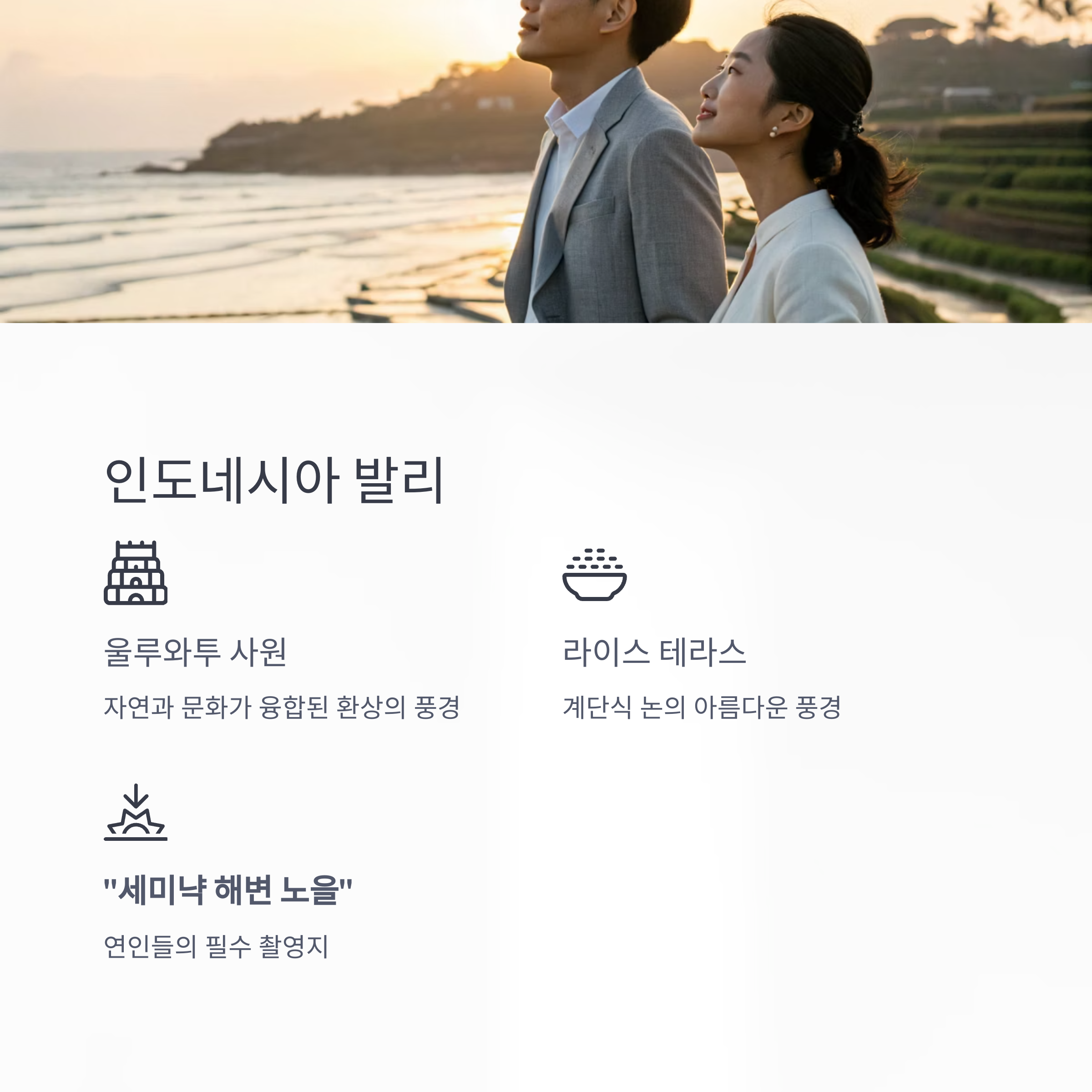 울루와투 사원이나 라이스 테라스는 자연과 문화가 융합된 환상의 풍경을 자랑합니다.