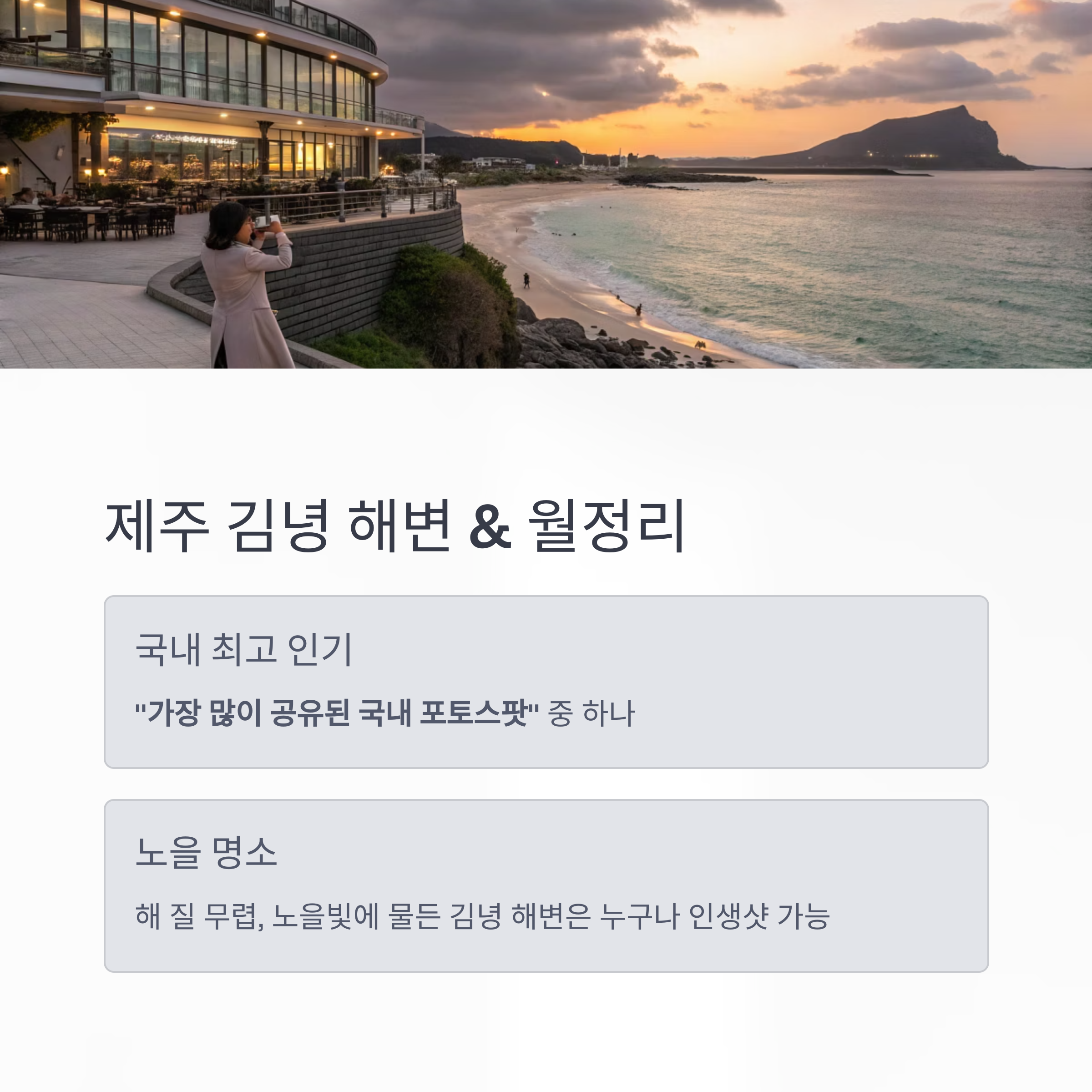 특히 해 질 무렵, 노을빛에 물든 김녕 해변은 누구나 인생샷을 건질 수 있습니다.