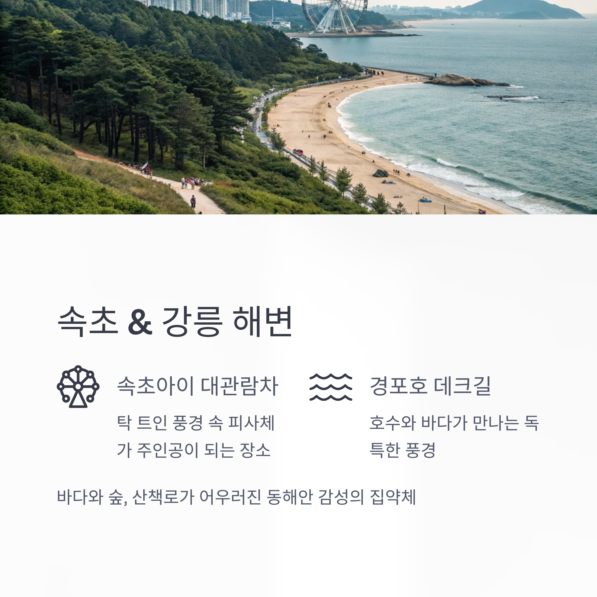 두 곳 모두 바다와 숲, 산책로가 어우러진 동해안 감성의 집약체입니다.