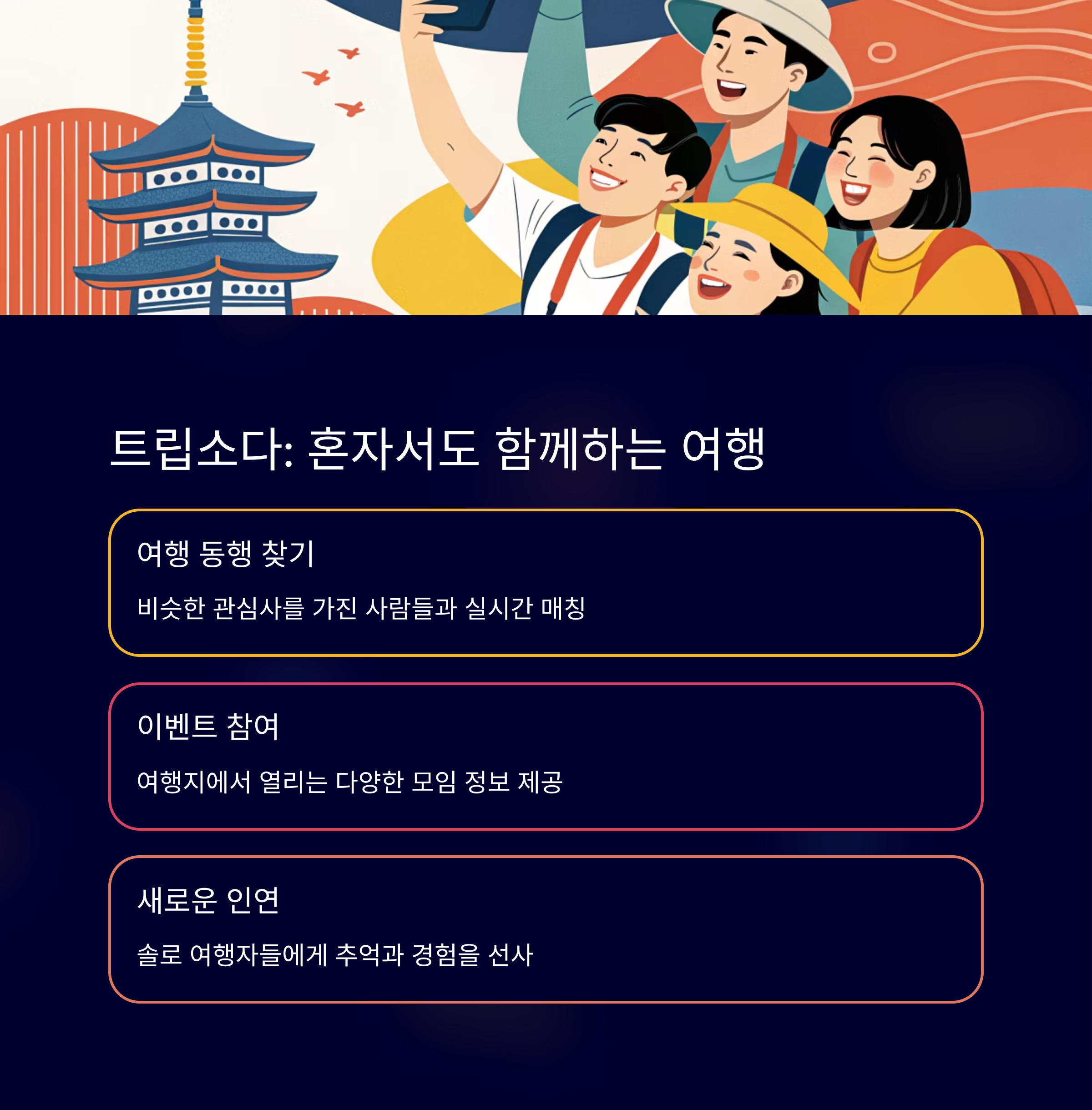 | 동행 찾기 | 트립소다 | 실시간 매칭 및 커뮤니티 기능 |