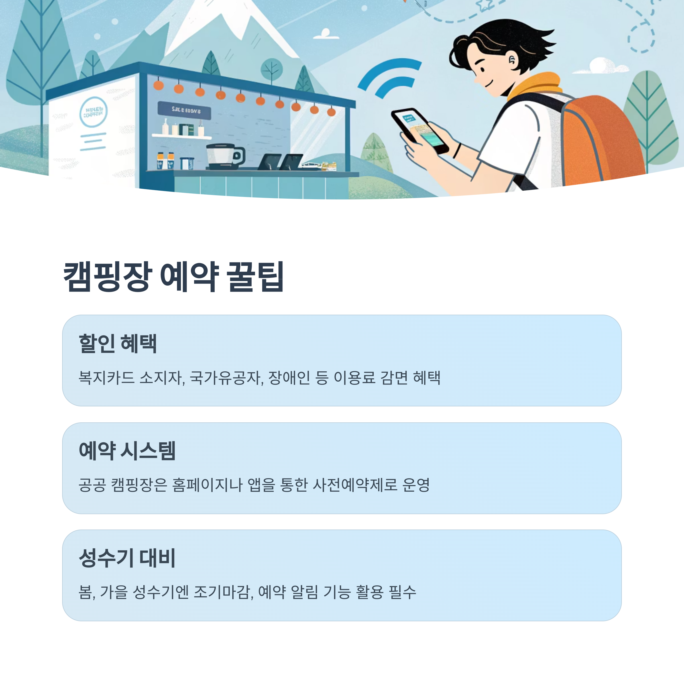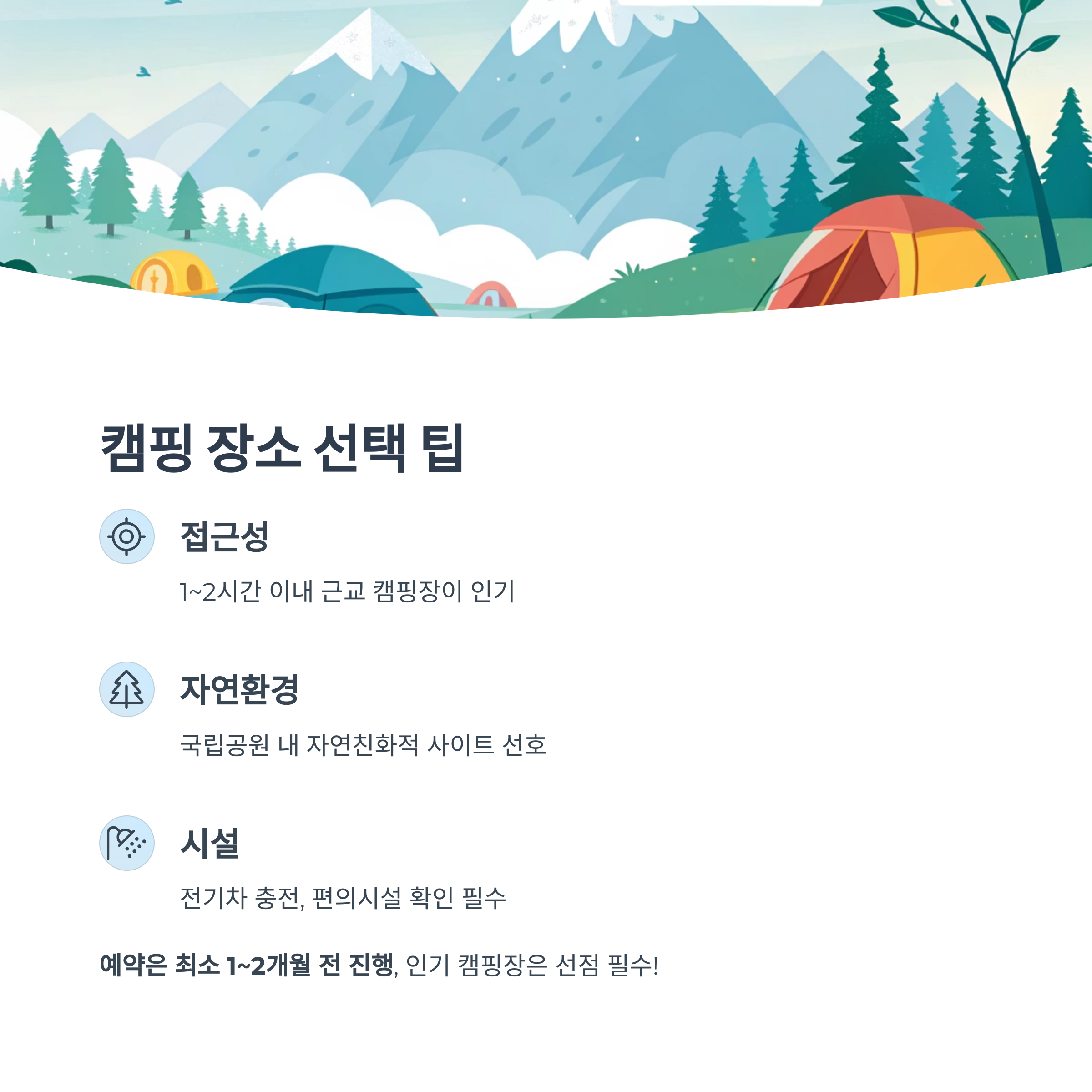 예약은 최소 1~2개월 전 진행, 인기 캠핑장은 선점 필수입니다.
