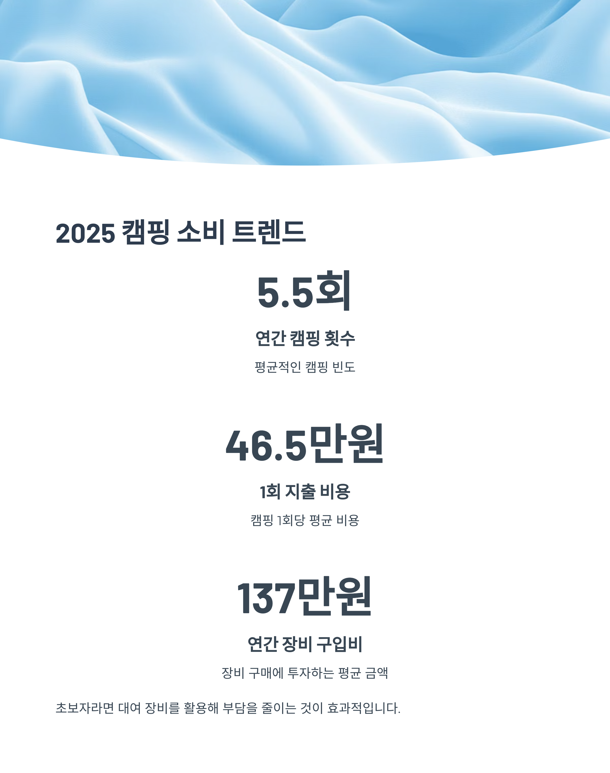 **"1회당 약 46.5만 원 지출, 연평균 5.5회 캠핑"**이 일반적입니다.