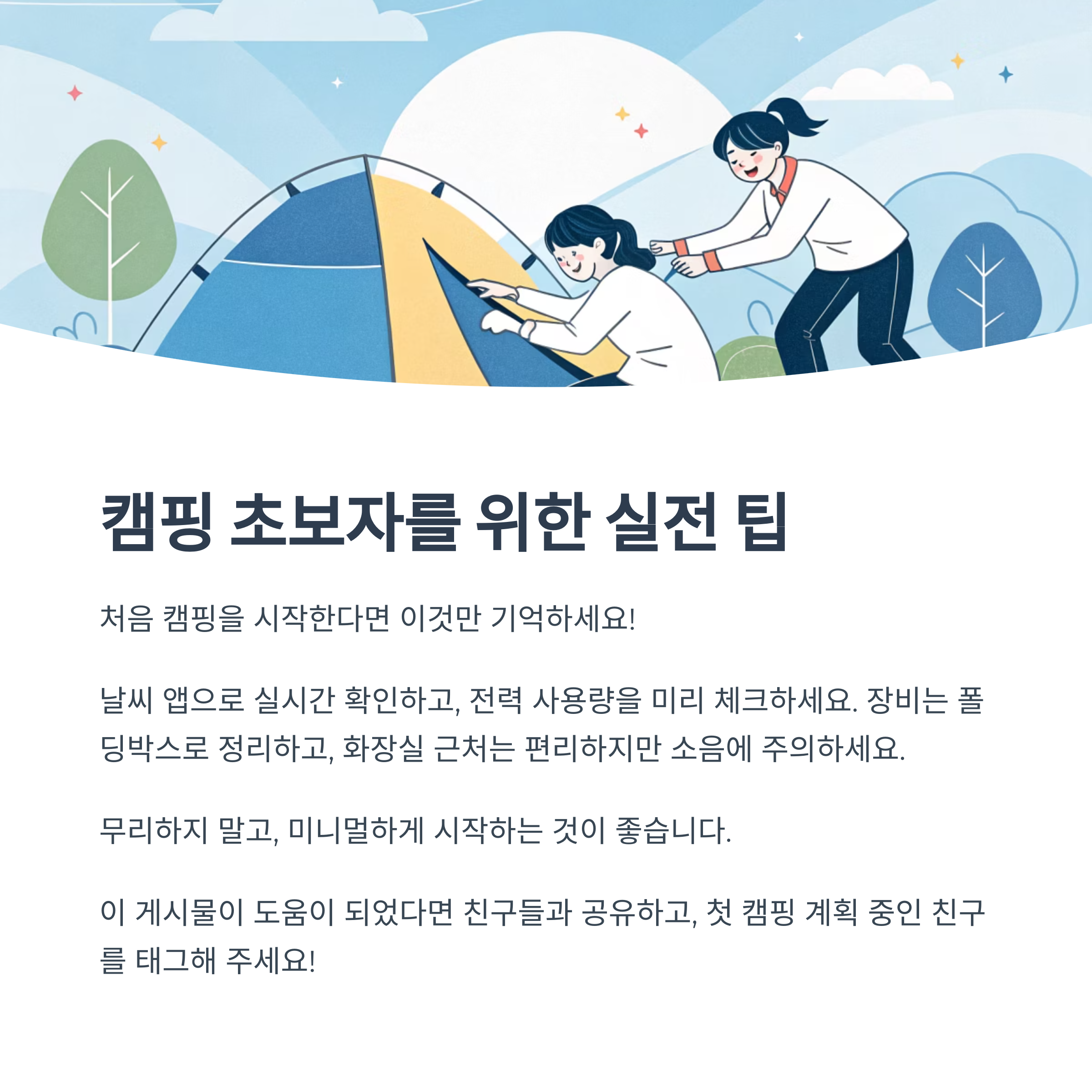 | 전기 준비 | 캠핑장 전력 확인, 멀티탭·파워뱅크 지참 |