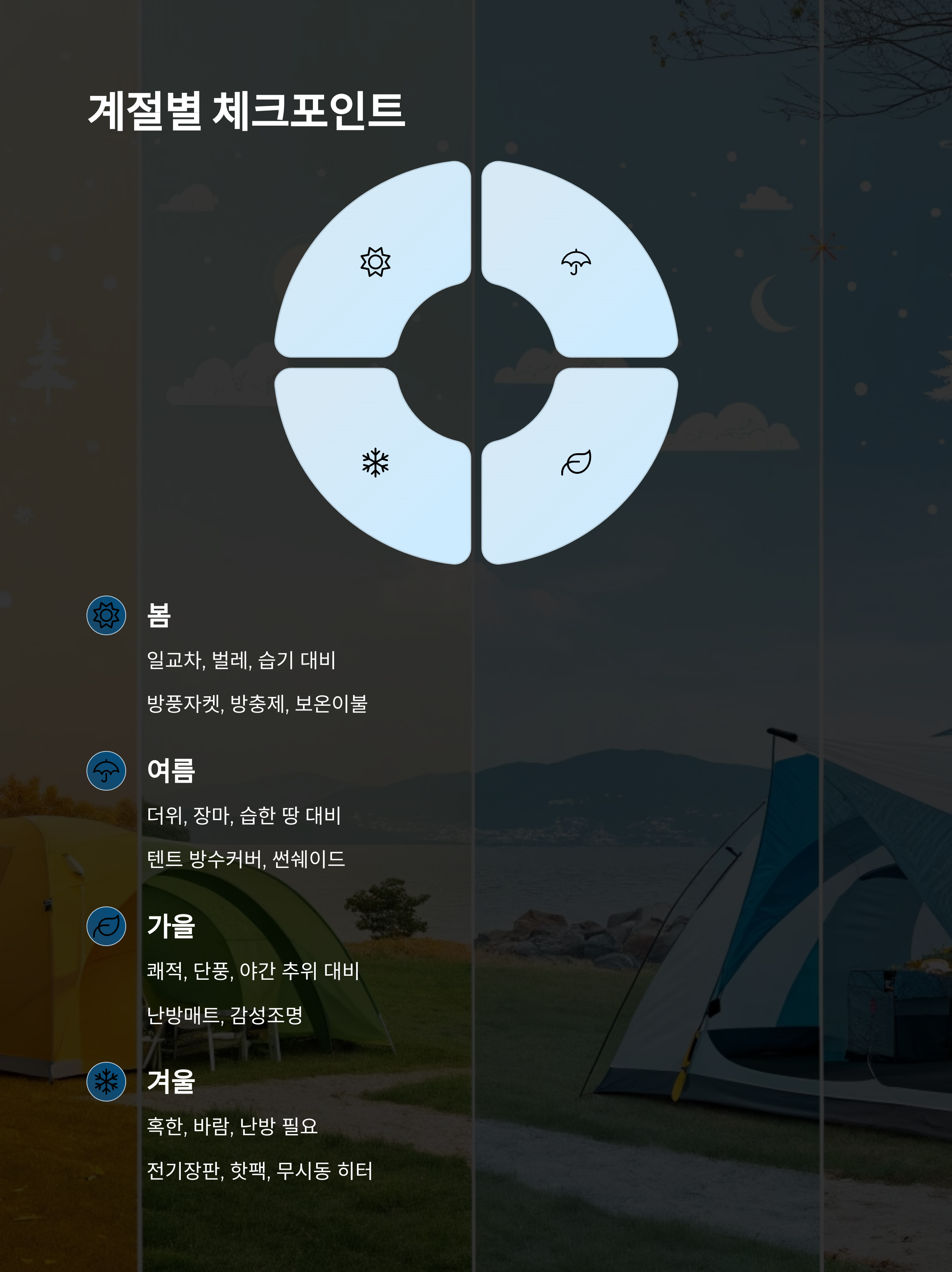 | 겨울 | 혹한, 바람, 난방 필요 | 전기장판, 핫팩, 무시동 히터 |