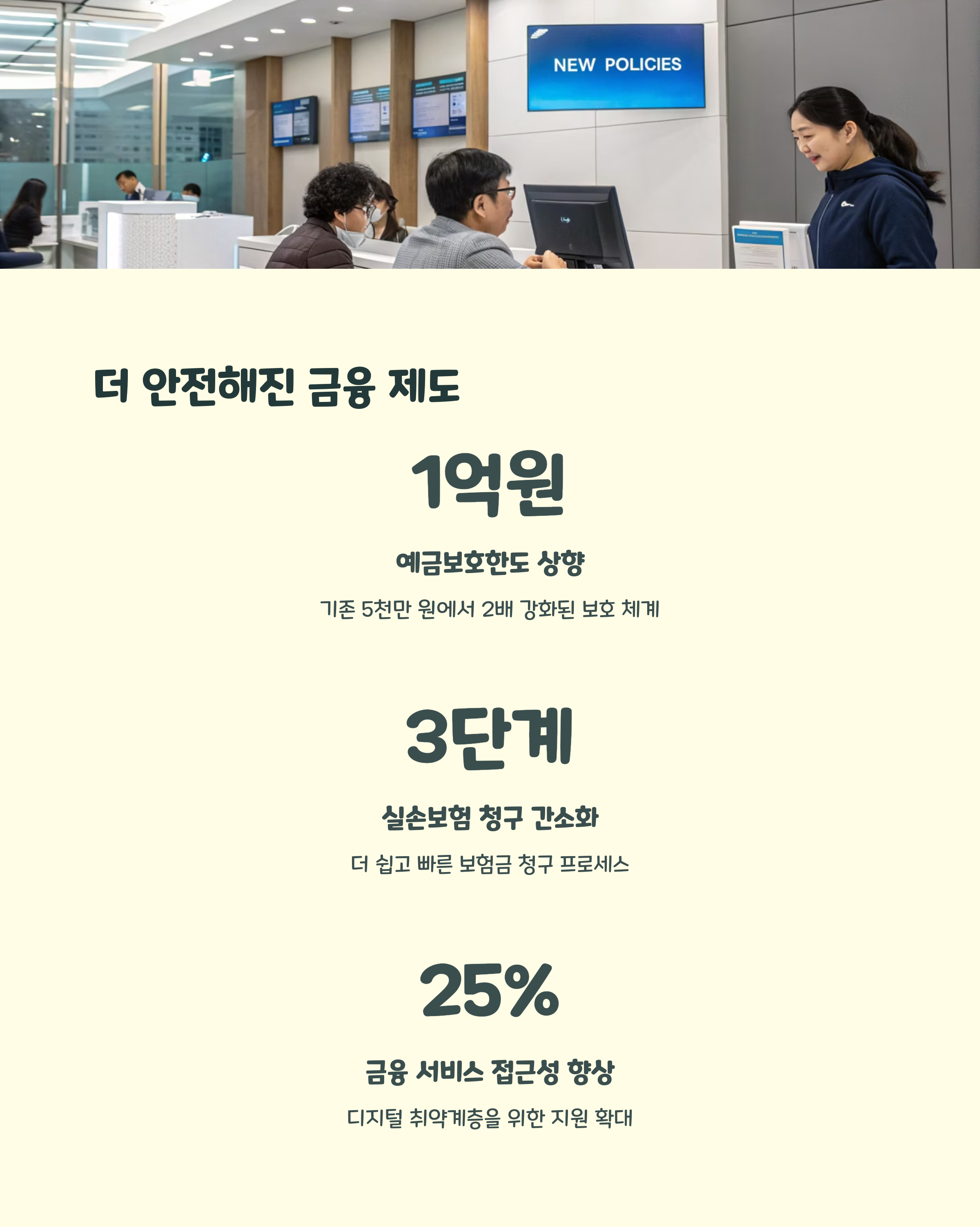 예금보호한도가 1인당 5천만 원 → 1억 원으로 상향 조정되었습니다. 이는 2001년 도입 이후 24년 만의 변경으로, 예금자의 재산 보호가 강화되었다고 볼 수 있습니다.