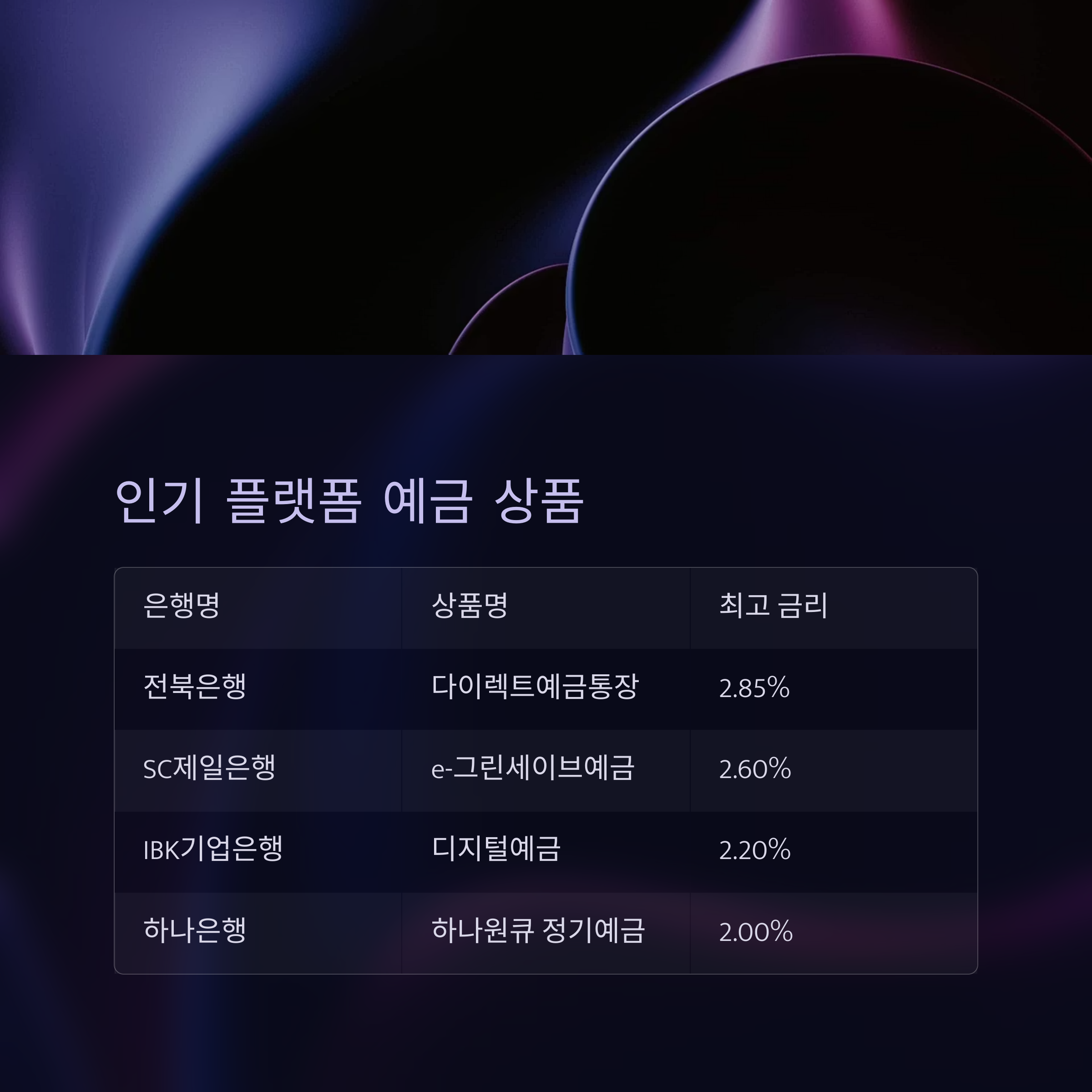 | 2 | 전북은행 | 다이렉트예금통장 | 2.85% | 온라인 전용 |
