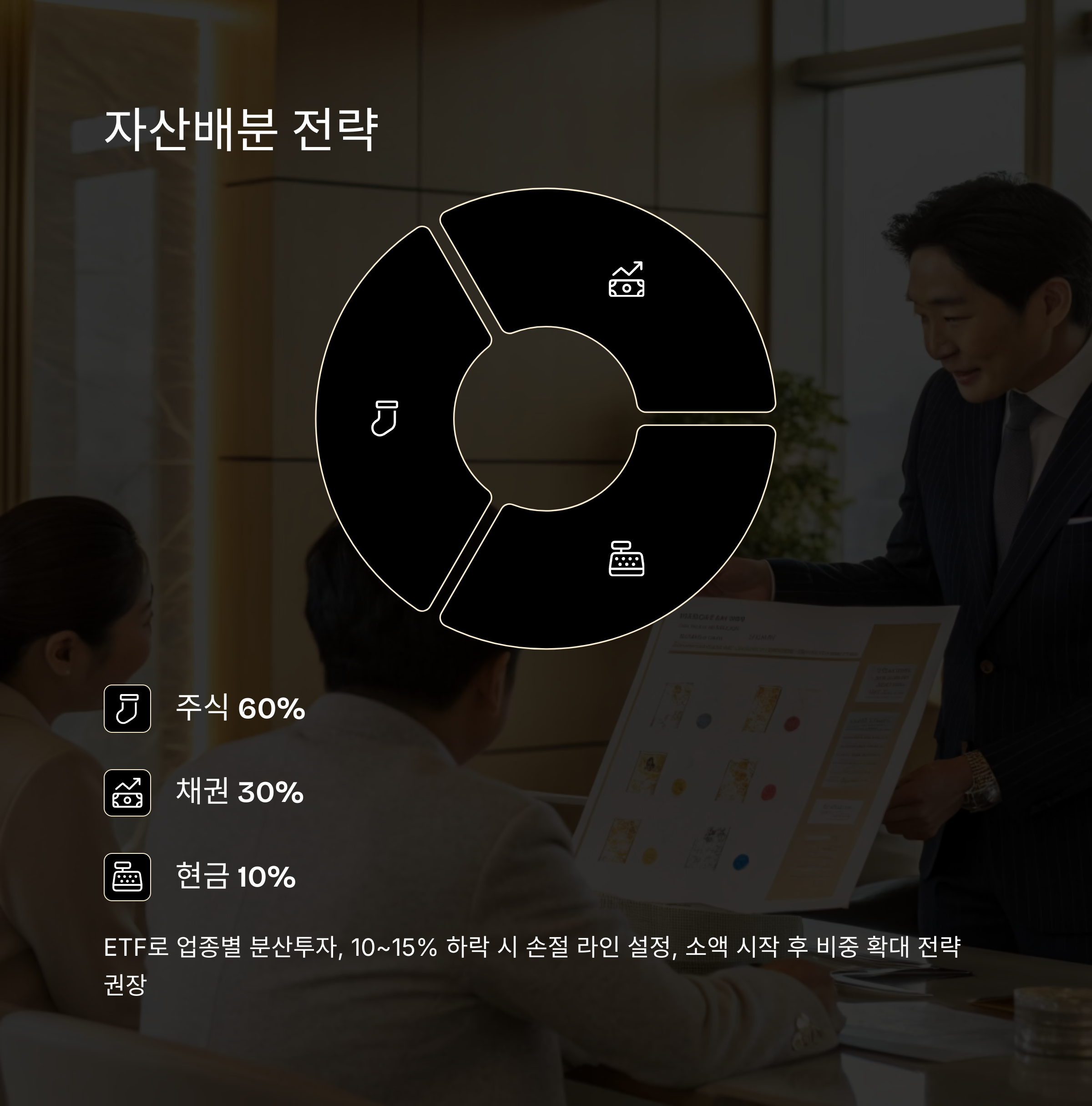 자산배분 권장 비중은 주식 60%, 채권 30%, 현금 10%입니다. ETF를 활용하여 업종별 분산투자를 고려하며, 손절 라인은 10~15% 하락 시 설정하여 큰 손실을 방지해야 합니다. 초기 투자 시 소액으로 시작하여 이후 비중을 확대하는 전략이 유효합니다.
