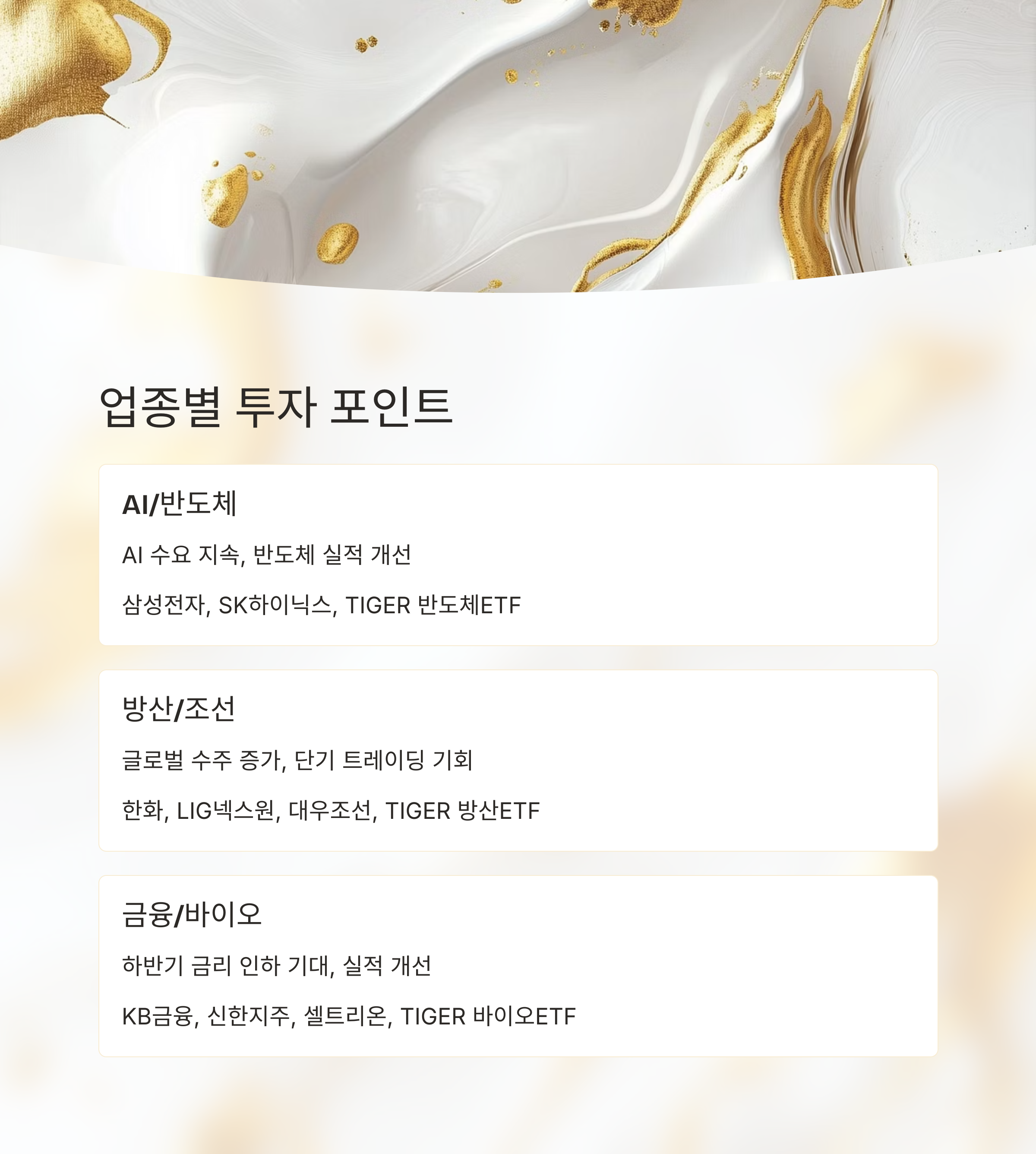 | 금융/바이오 | 하반기 금리 인하 기대, 실적 개선 | KB금융, 신한지주, 셀트리온, TIGER 바이오ETF | 상반기 vs 하반기 차별화 |