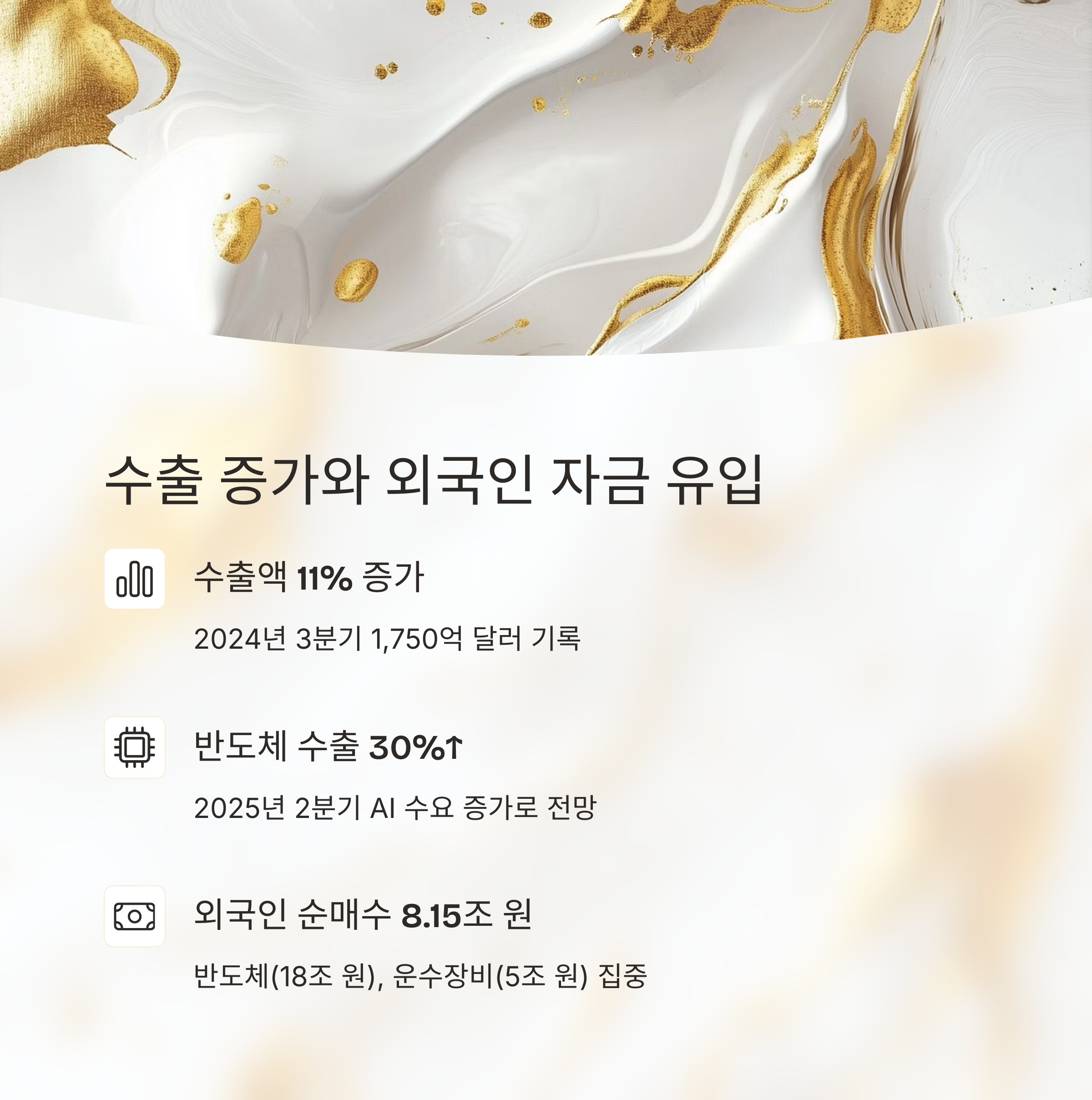 2024년 3분기 수출액은 전년 대비 11% 증가한 1,750억 달러를 기록하였습니다. 특히 2025년 2분기 반도체 수출은 AI 수요 증가에 힘입어 30% 이상의 성장이 전망됩니다. 이러한 수출 호조는 외국인 자금 유입으로 이어져, 2024년 외국인 순매수는 8.15조 원에 달하였습니다. 이는 반도체와 운수장비 업종에서 각각 18조 원, 5조 원의 순매수가 이루어진 결과입니다.