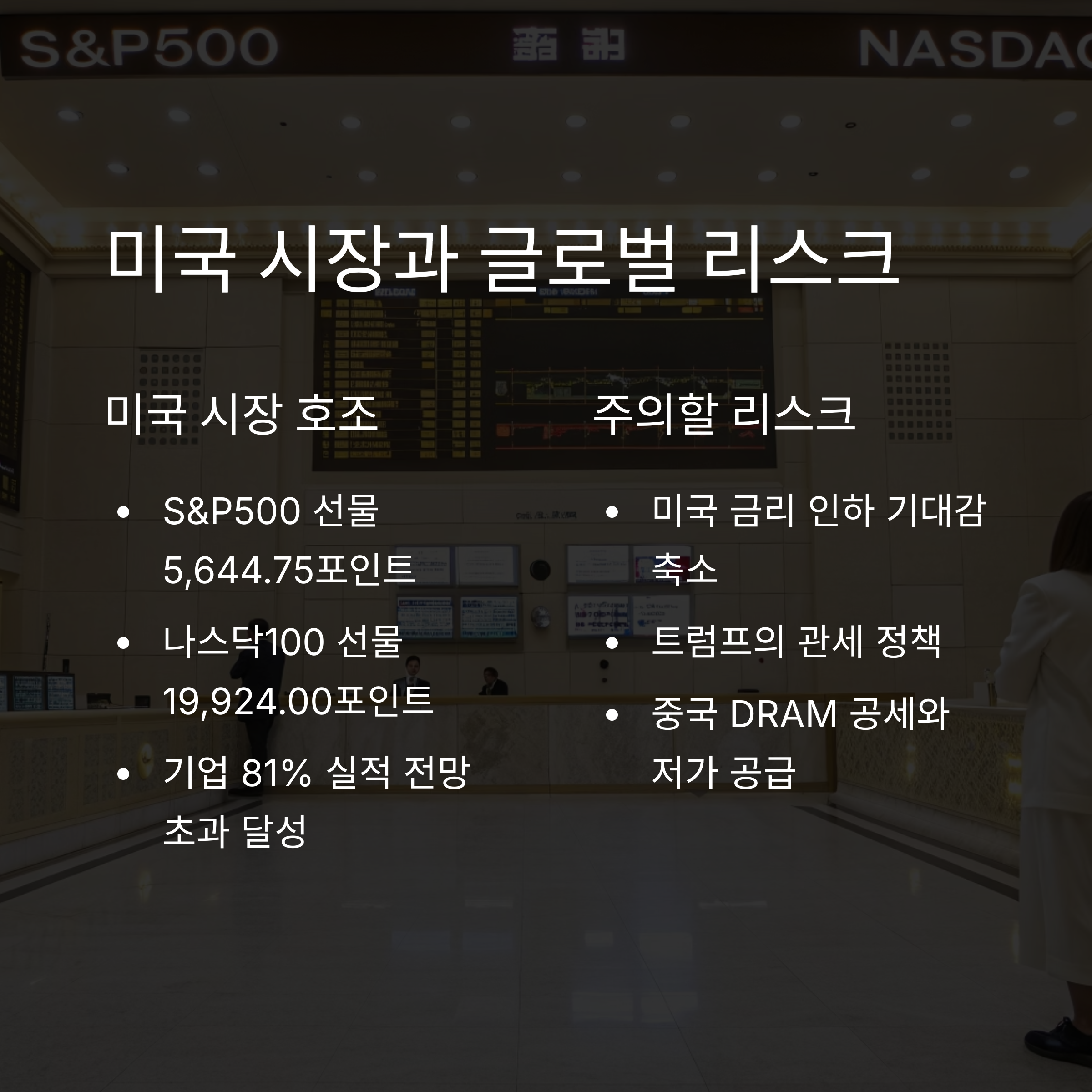미국 시장에서는 S&P500 선물이 5,644.75포인트, 나스닥100 선물이 19,924.00포인트를 기록하였습니다. S&P500 기업의 81%가 실적 전망을 초과 달성하였으며, 특히 AI와 클라우드 산업에서 매출 상승세가 두드러졌습니다. 그러나 미국의 금리 인하 기대감 축소와 트럼프 대통령의 관세 정책 등은 글로벌 리스크 요인으로 작용하고 있습니다. 또한, 중국의 DRAM 공세와 저가 공급도 주의해야 할 요소입니다.
