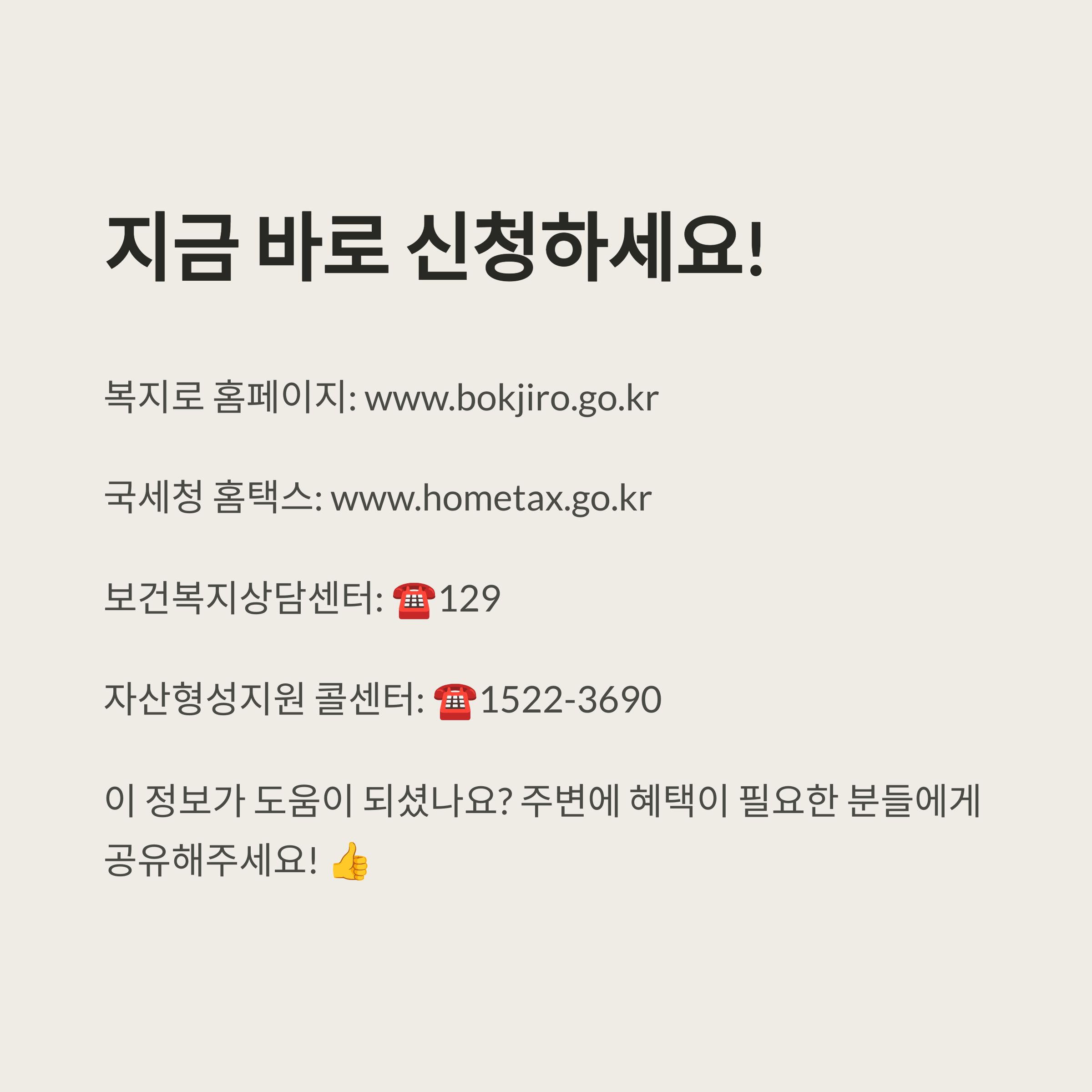 - 신청 방법: 복지로 홈페이지(www.bokjiro.go.kr) 또는 주민센터
