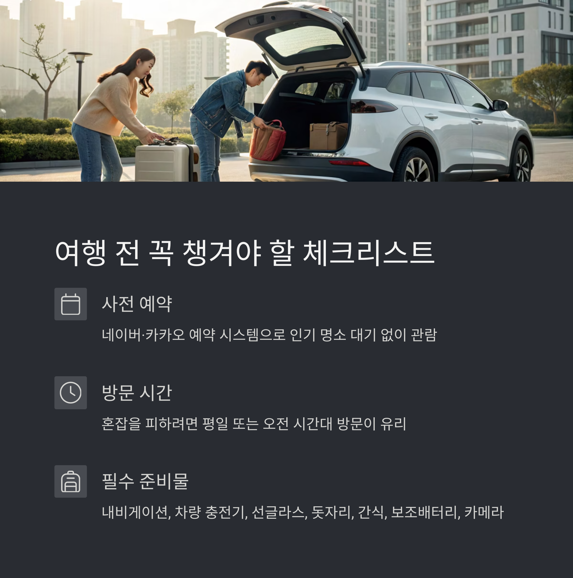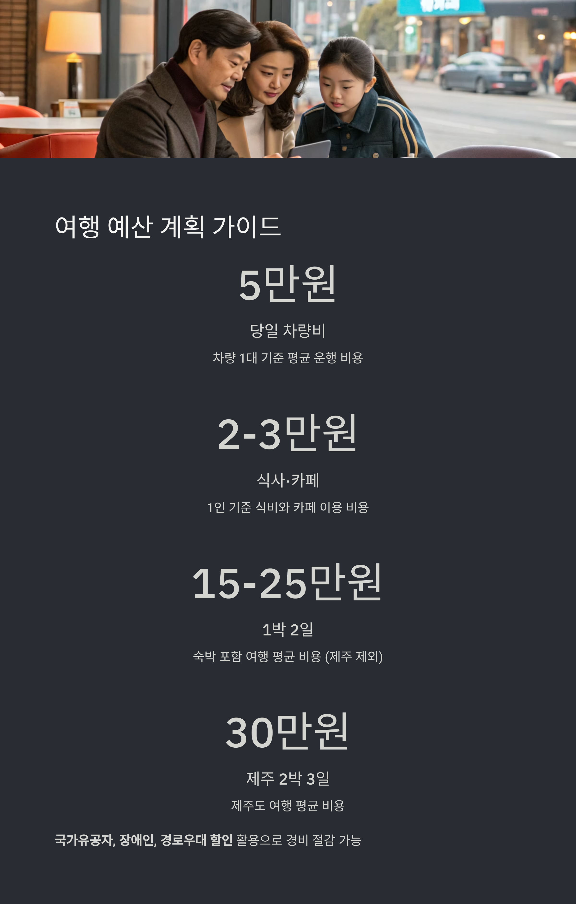 당일치기 기준 차량 1대 약 5만 원, 식사·카페비 1인 23만 원,1만5천 원 수준입니다. 숙박 포함 시 1박 2일 기준