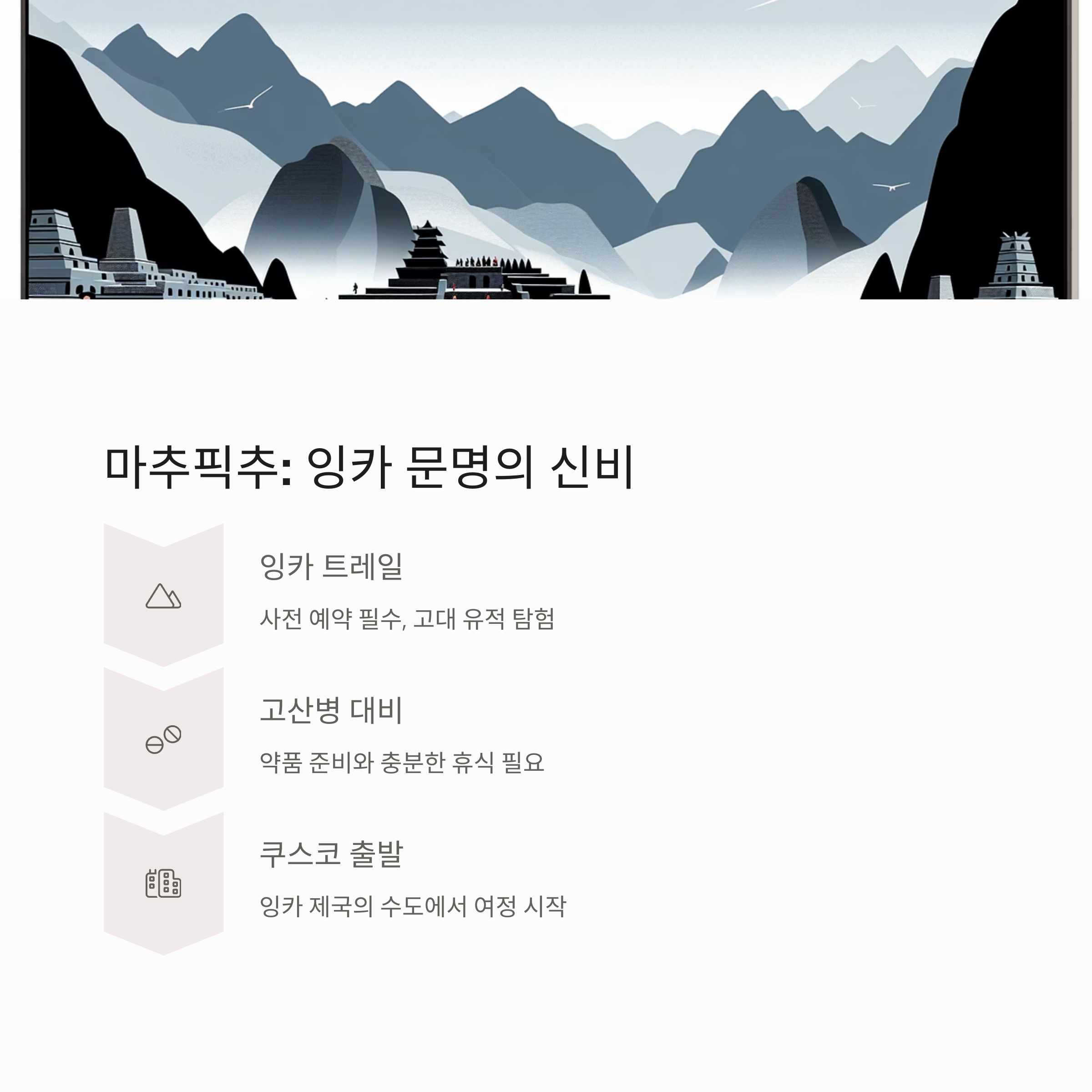 | 마추픽추 | 200만 원 이상 | 항공권, 입장료, 가이드 | 잉카 트레일 사전 예약 필수 |