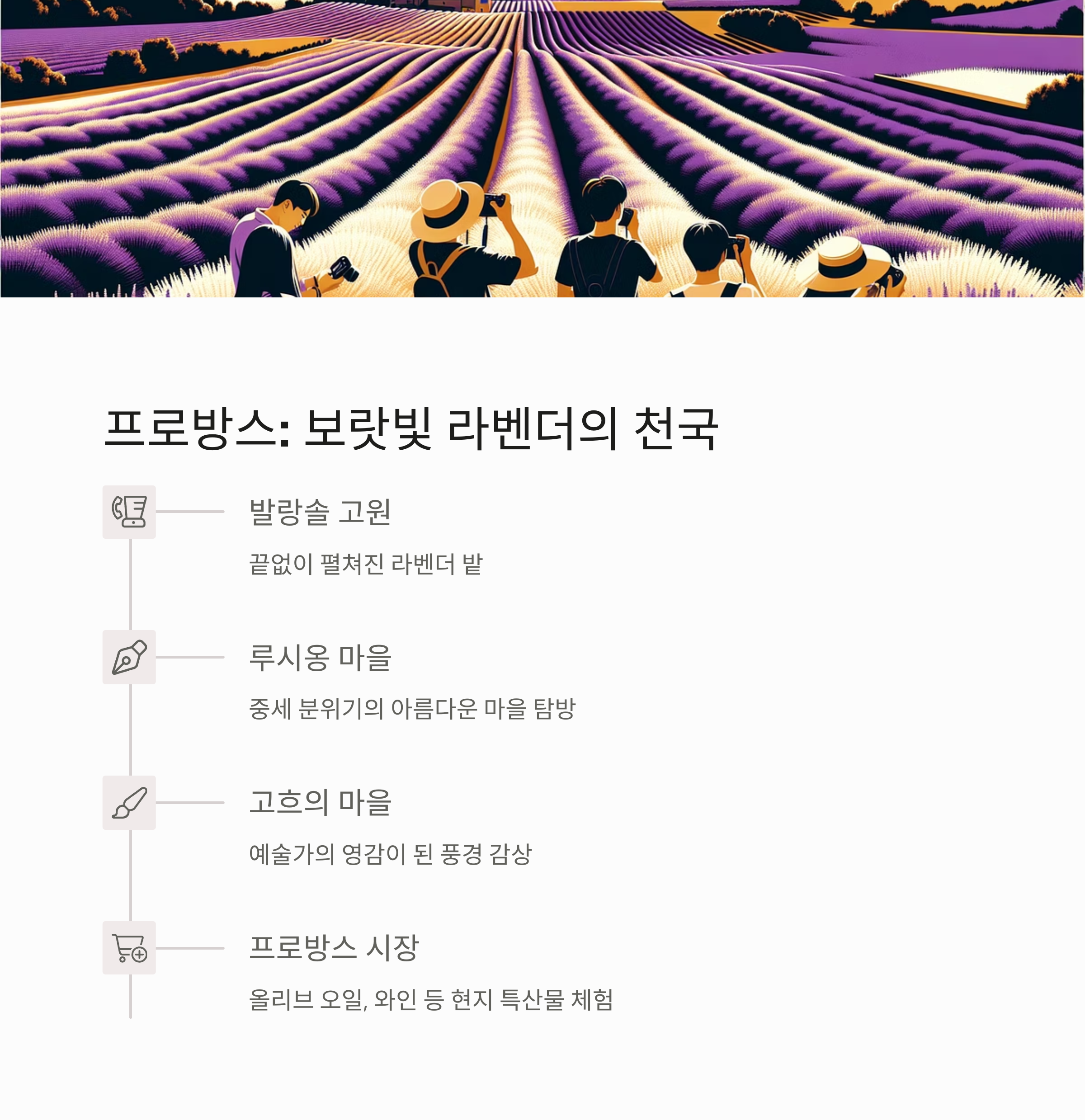 6월의 프로방스는 라벤더가 만개하는 시기로, 보라색 물결이 펼쳐진 장관을 감상할 수 있습니다.