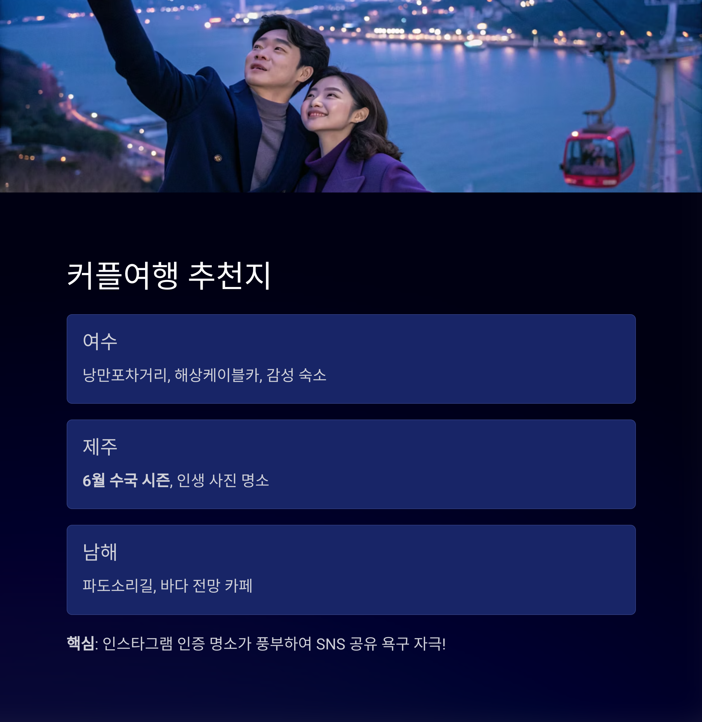 여수, 제주, 남해는 바다, 야경, 먹거리, 감성 숙소까지 커플이 좋아할 요소를 모두 갖춘 여행지입니다.