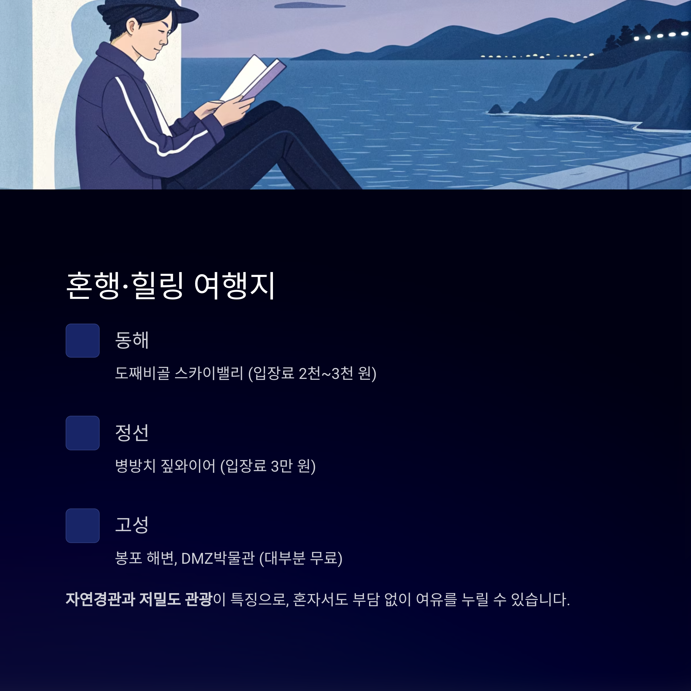 강원 동해·정선·고성·포천은 자연경관과 저밀도 관광이 특징으로, 혼자서도 부담 없이 여유를 누릴 수 있습니다.