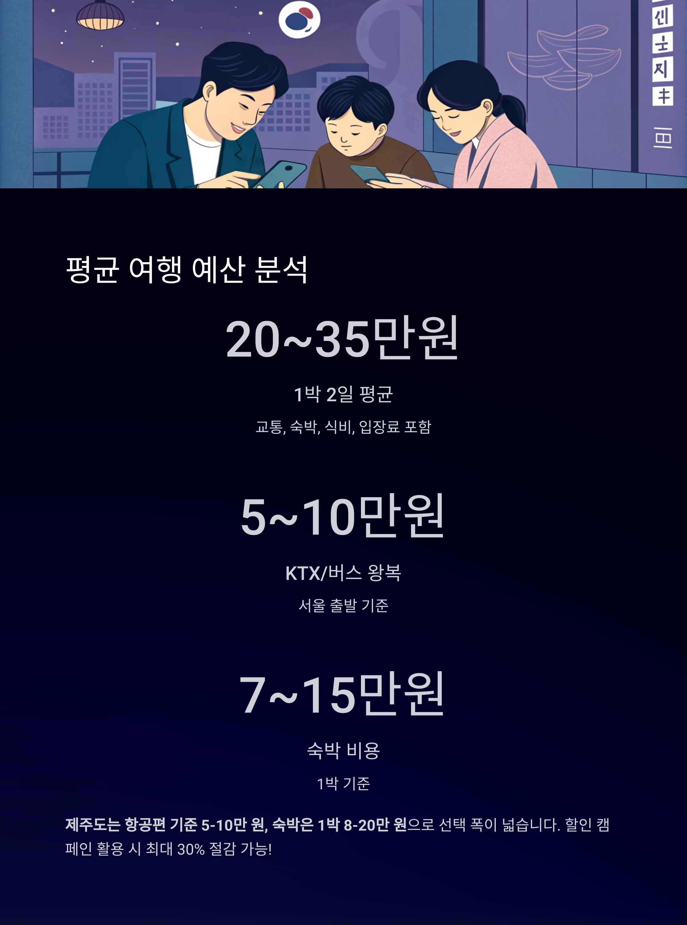 여행가는 달 캠페인 및 숙박 할인권 활용 시, 전체 비용의 최대 30%까지 절감 가능합니다.
