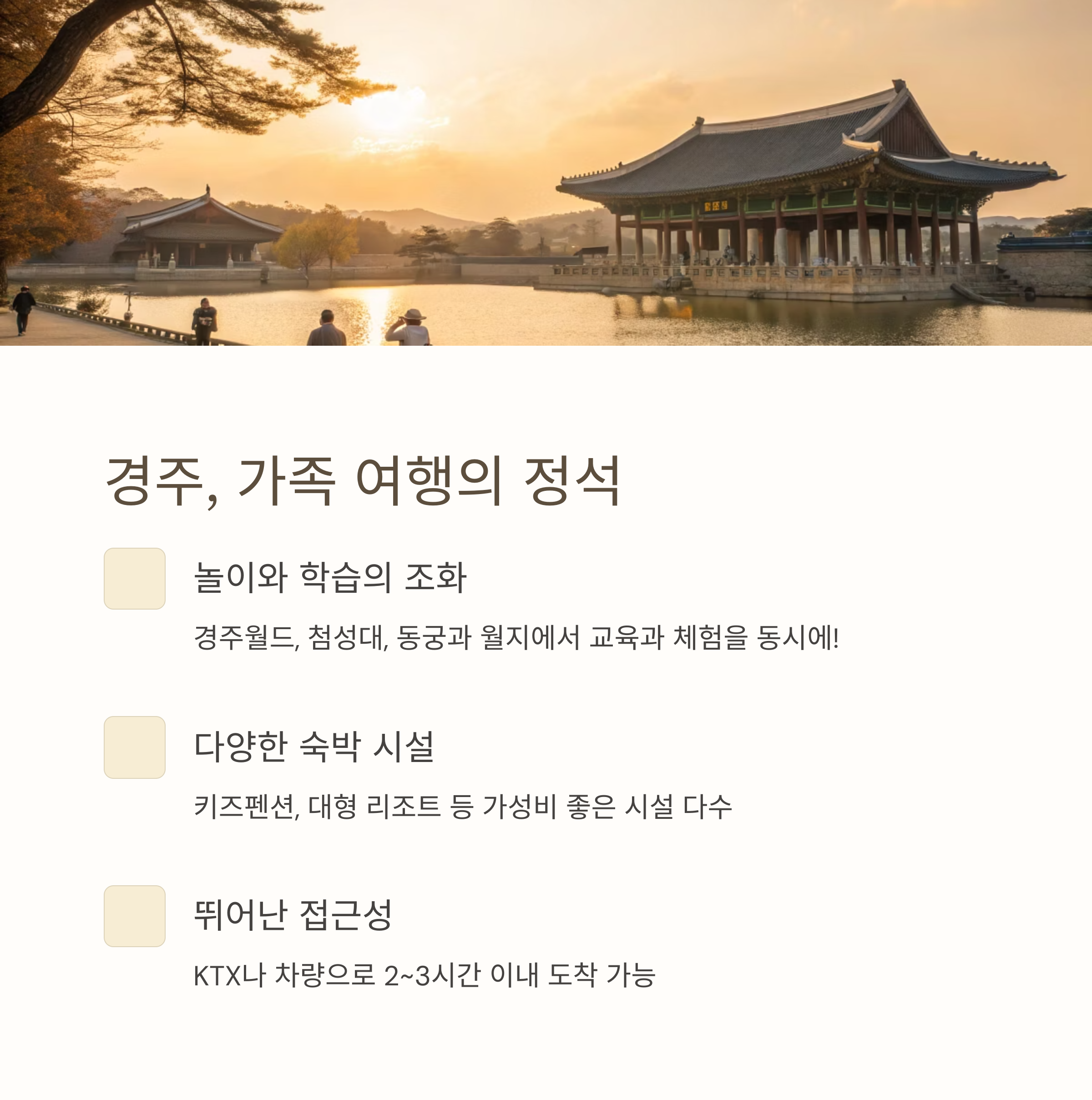 가족 단위 여행객들에게 높은 만족도를 주고 있습니다. 경주는 교통 접근성도 좋아