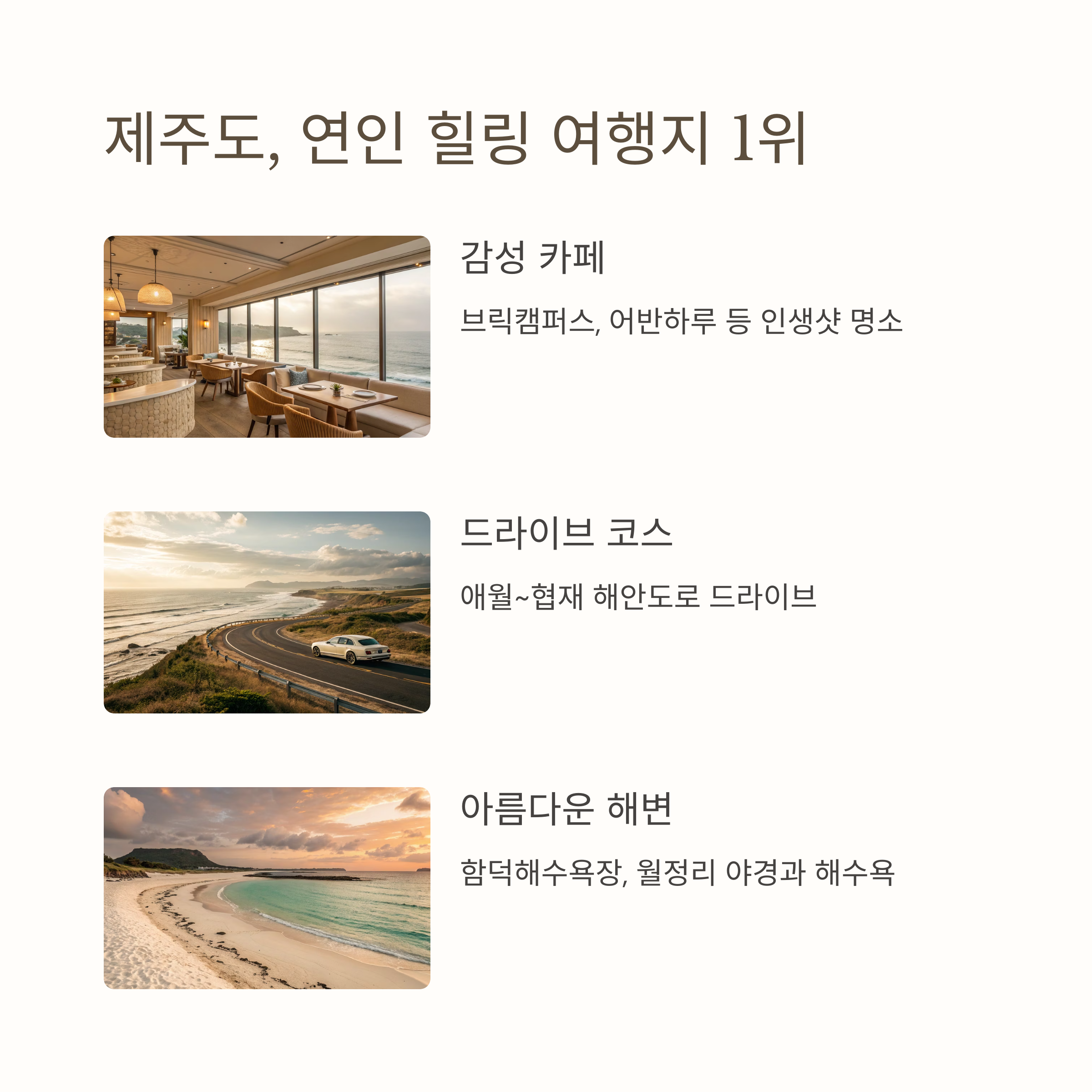 제주도는 연인 여행지 부동의 1위로, 감성 카페와 바닷길 드라이브가 유명합니다.