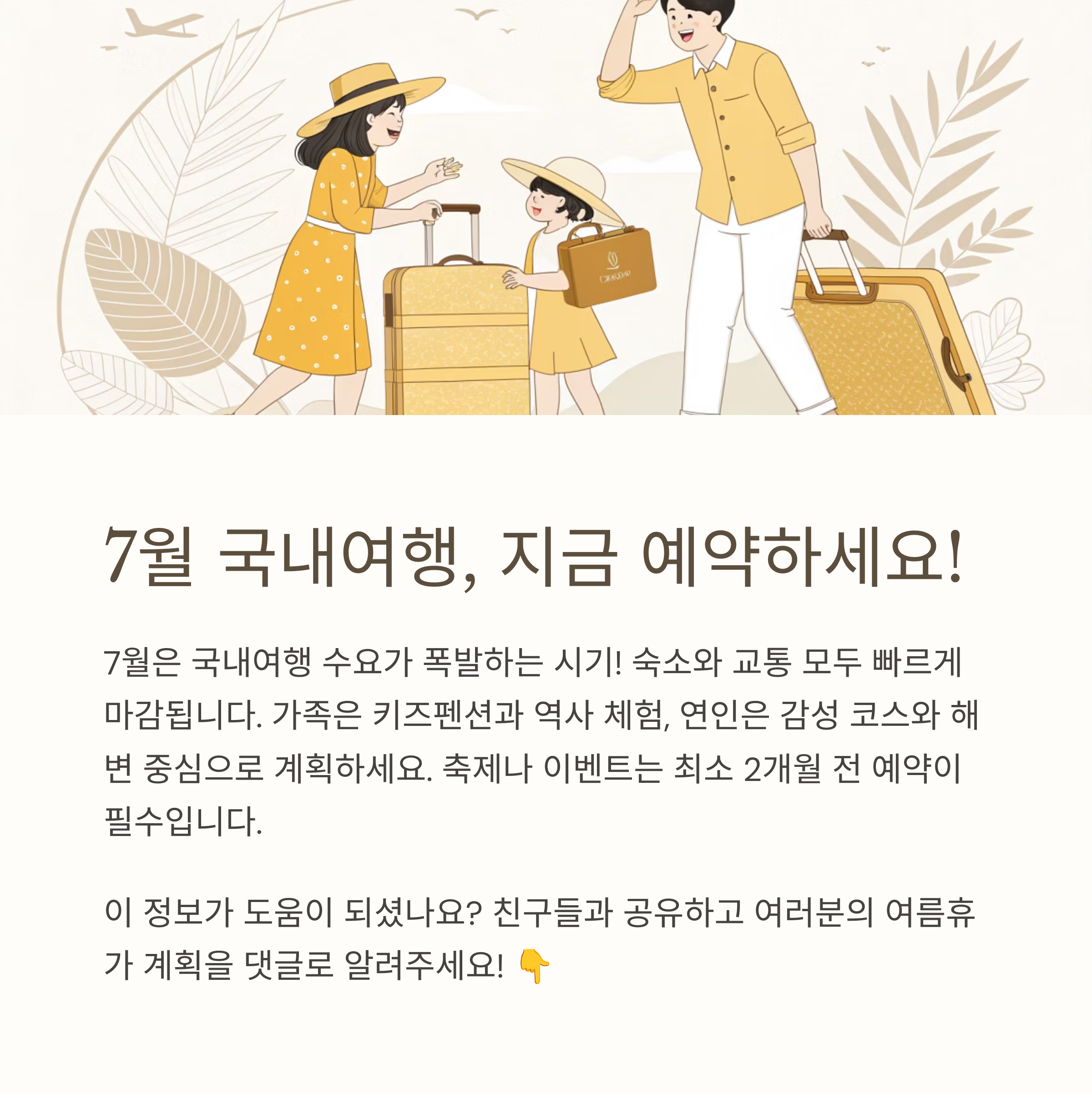 2025년 7월, 국내여행에 대한 관심이 뜨겁게 달아오르고 있습니다. 해외여행보다 가까우면서도 즐길 거리가 풍부한 국내 명소들이 높은 예약률을 기록 중인데요. 특히 KTX나 차량으로 4시간 이내 이동 가능한 지역이 인기이며, 가족 단위와 커플 여행객 모두에게 맞춤형 코스를 소개합니다. 실제 예약 데이터와 여행 트렌드를 기반으로 7월에 꼭 가야 할 베스트 여행지를 정리했습니다.