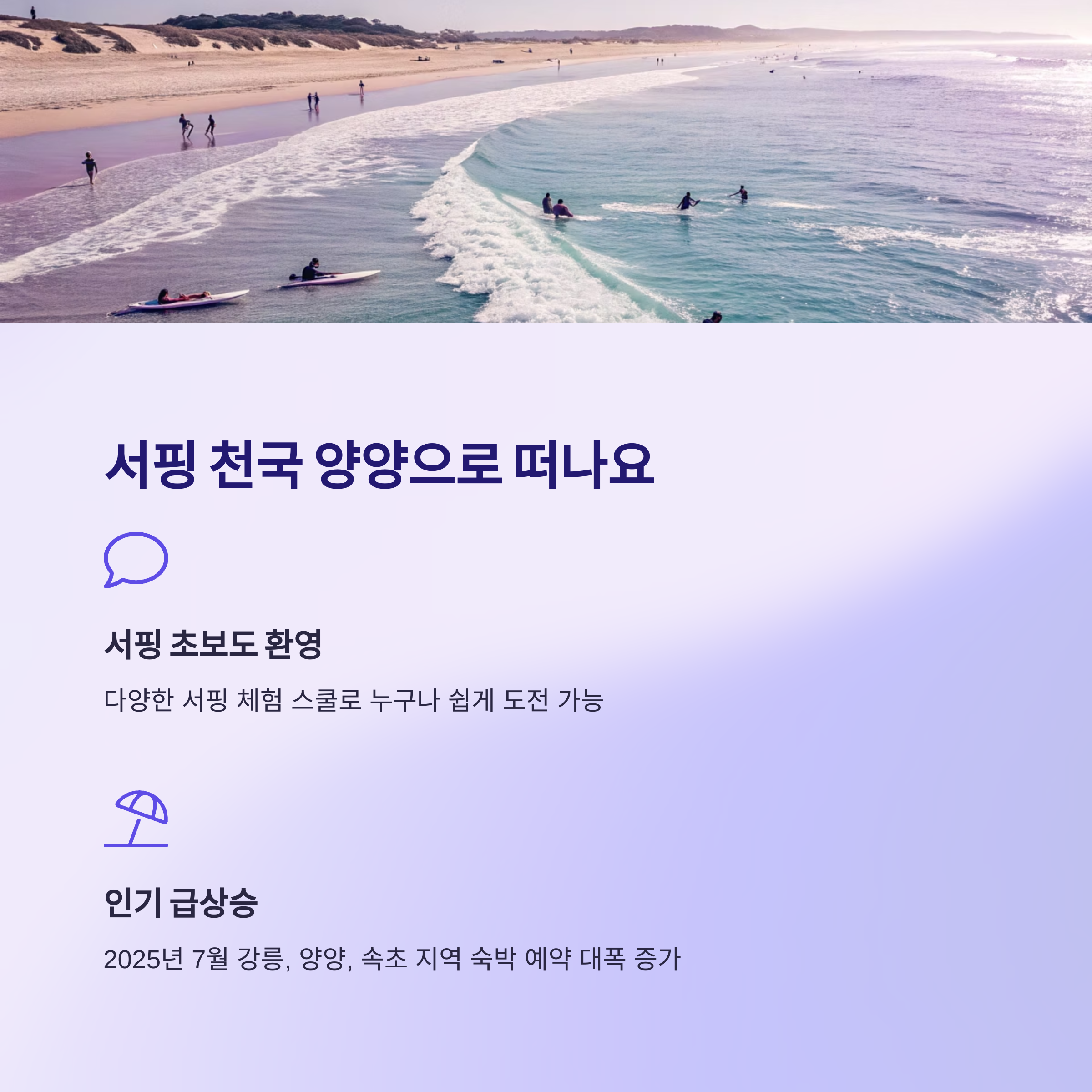 강원도 동해안은 2025년 여름 가장 핫한 여행지로 급부상했습니다 특히 양양은 국내 최고의 서핑 명소로 유명하며 다양한 서핑 체험 스쿨이 운영돼 초보자들도 쉽게 도전할 수 있습니다 또한 강릉 경포대와 속초 설악해수욕장은 아름다운 해변 풍경과 투명한 바닷물로 많은 인기를 끌고 있습니다 실제 2025년 7월 강릉과 양양, 속초 지역 숙박 예약이 지난해보다 크게 증가한 것으로 나타났습니다