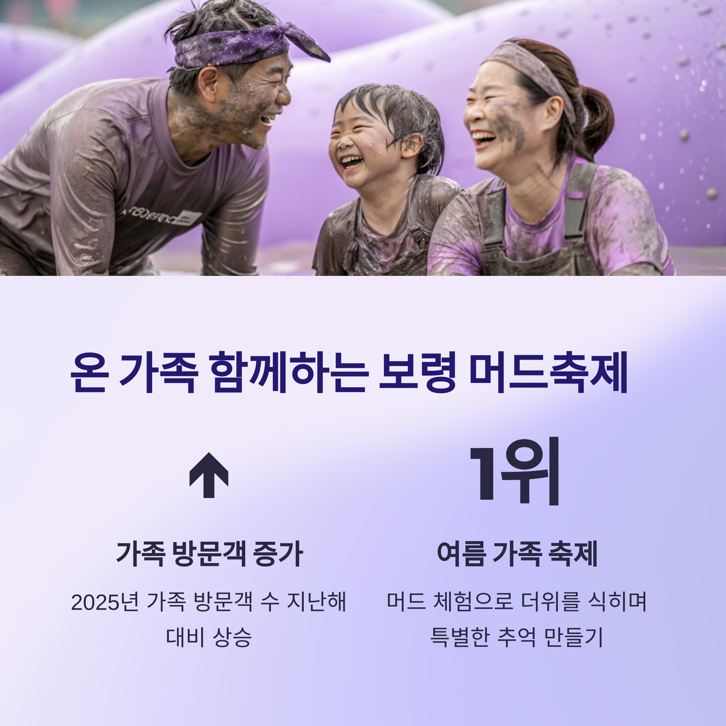 보령 머드축제는 가족 여행객들에게 가장 인기 있는 여름 축제 중 하나로 자리매김했습니다 머드 체험으로 더위를 식히며 특별한 추억을 만들 수 있습니다 특히 2025년에는 가족 방문객 수가 지난해보다 증가해 여름 대표 가족 축제로 자리 잡았습니다