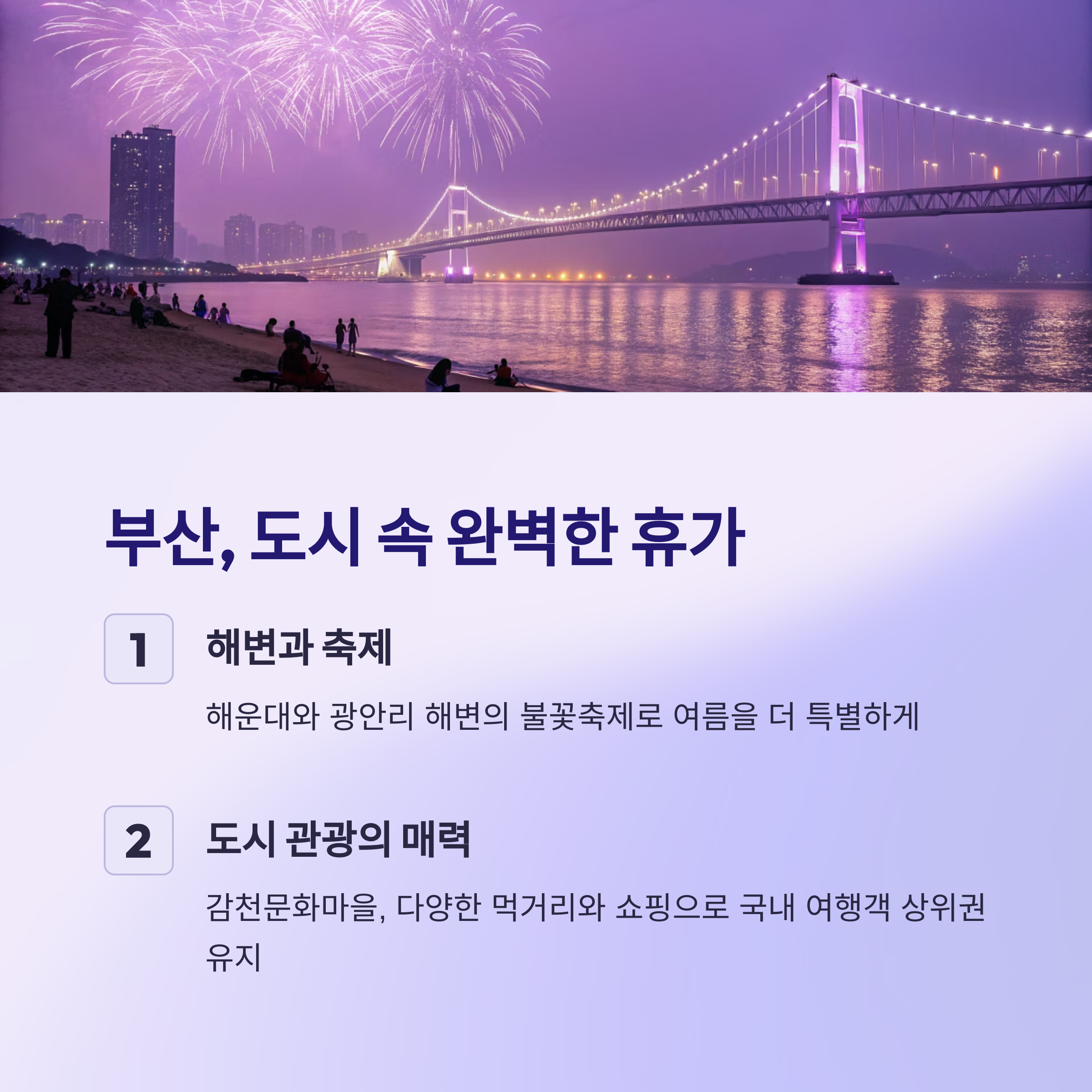 부산은 해운대와 광안리 해변의 불꽃축제로 유명하며 도시에서 즐기는 여름 피서지로 인기를 끌고 있습니다 감천문화마을과 다양한 먹거리, 쇼핑 명소들이 많아 관광객 만족도가 높습니다 2025년 7월 기준으로 부산은 국내 여행객들이 가장 많이 찾는 도시 중 상위권을 유지하고 있습니다