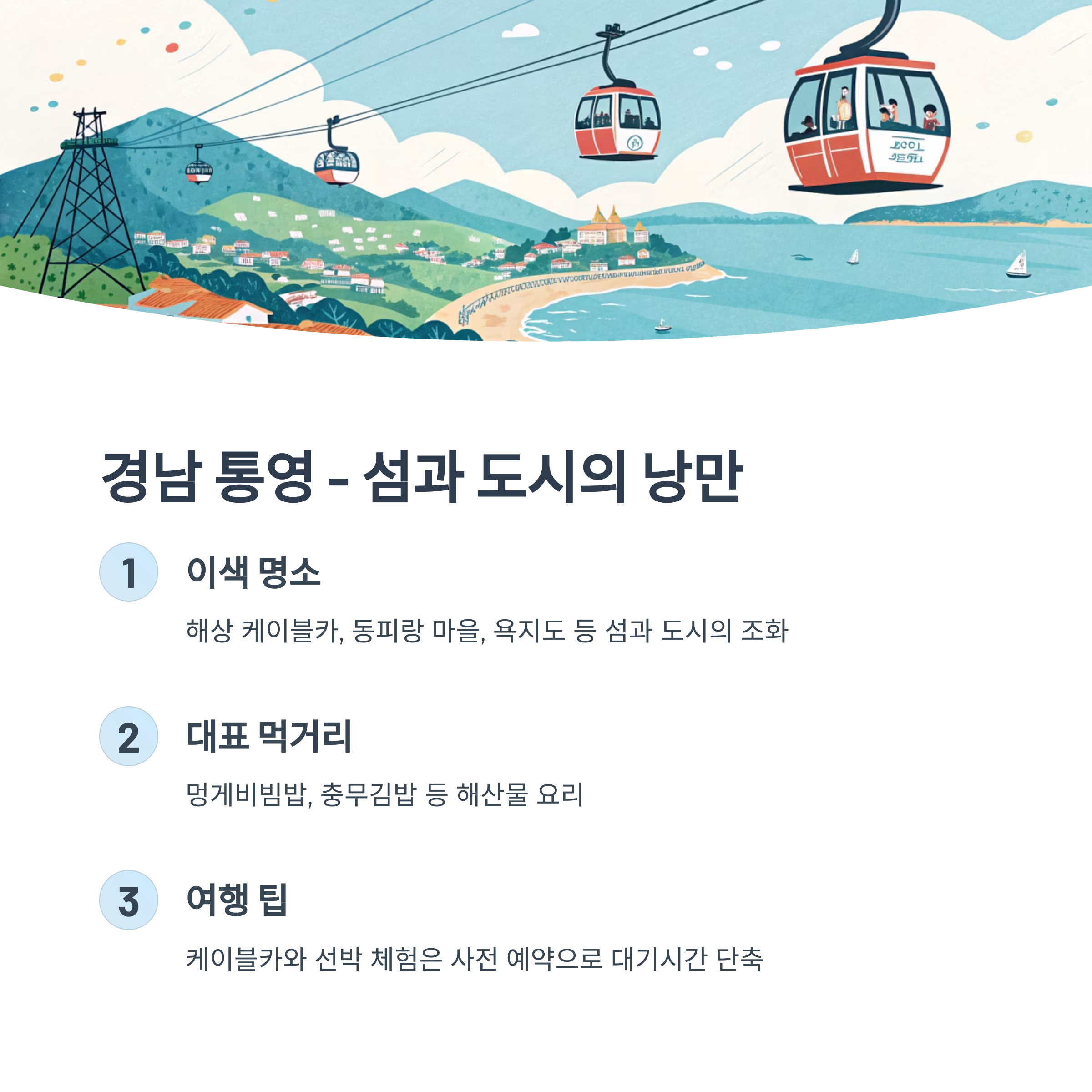 통영은 해상 케이블카, 동피랑 마을, 욕지도 등 섬과 도시가 어우러진