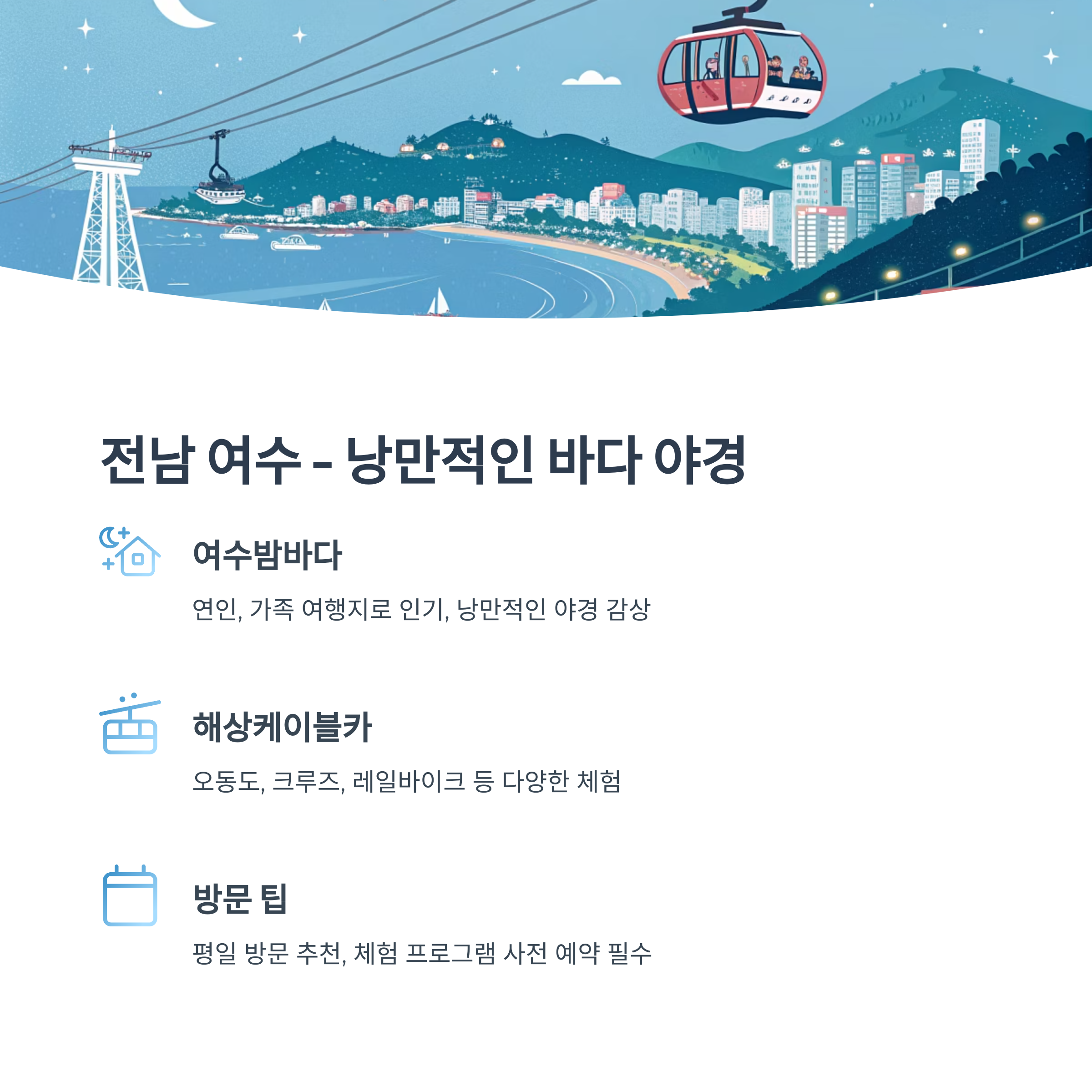 느낄 수 있는 대표적인 도시입니다. 여수밤바다, 해상케이블카, 오동도 등