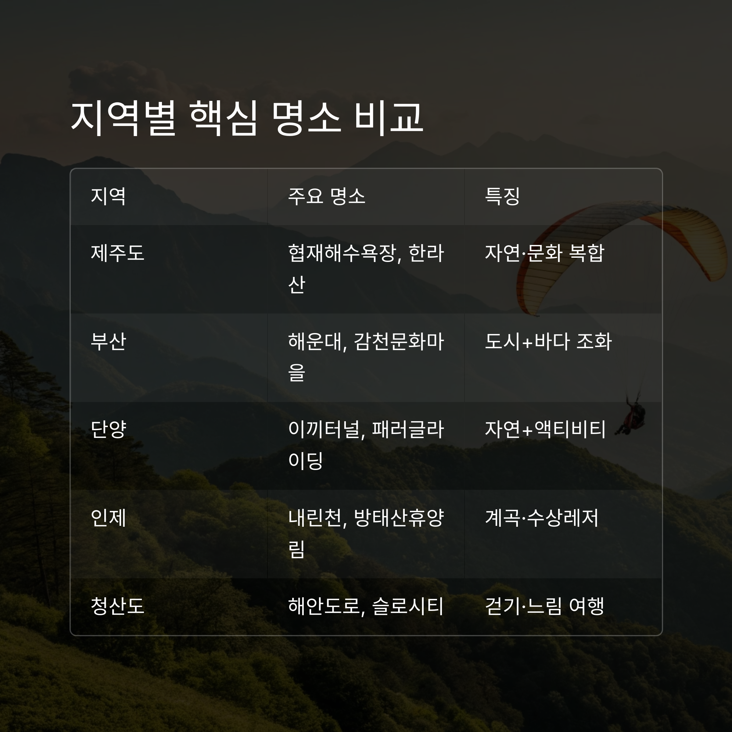 | 단양 | 이끼터널, 패러글라이딩 | 자연+액티비티 중심 여행지 |