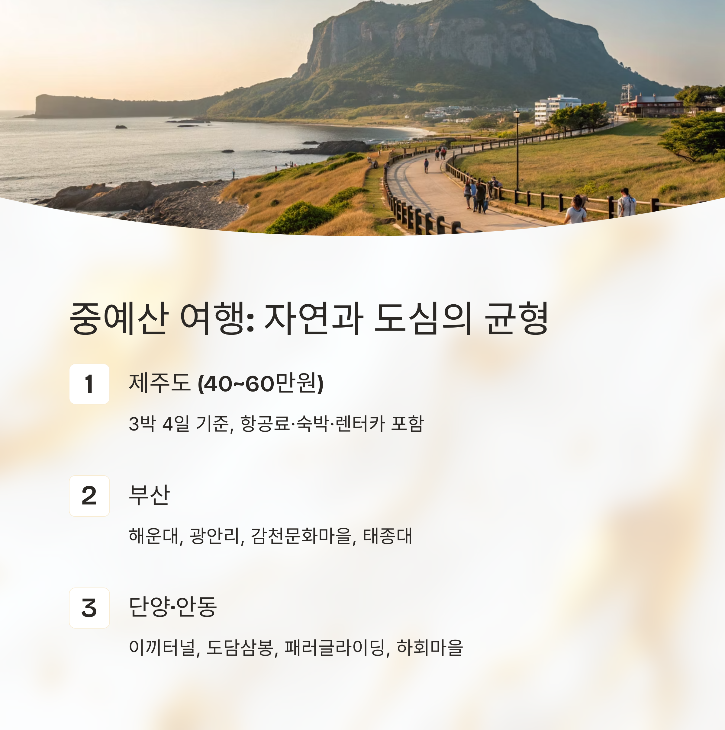 1인당 30만80만 원 예산이라면 제주도와 부산, 단양, 안동, 보령 등이 적합합니다.60만 원 수준이며,