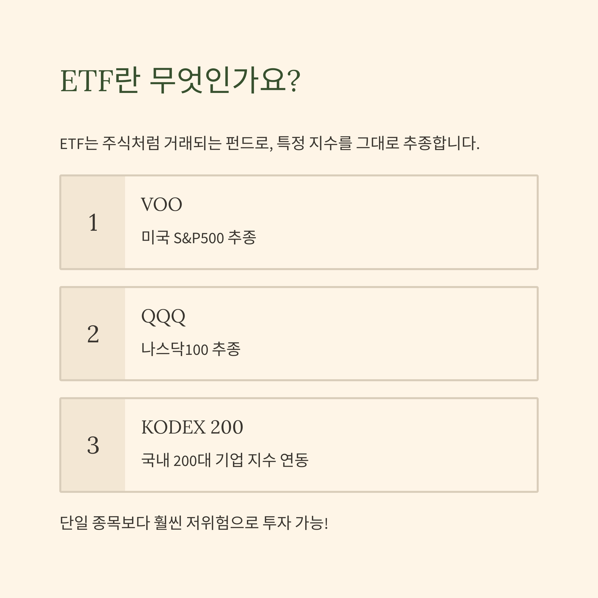 ETF는 주식처럼 거래되는 펀드로, 특정 지수를 그대로 추종합니다.