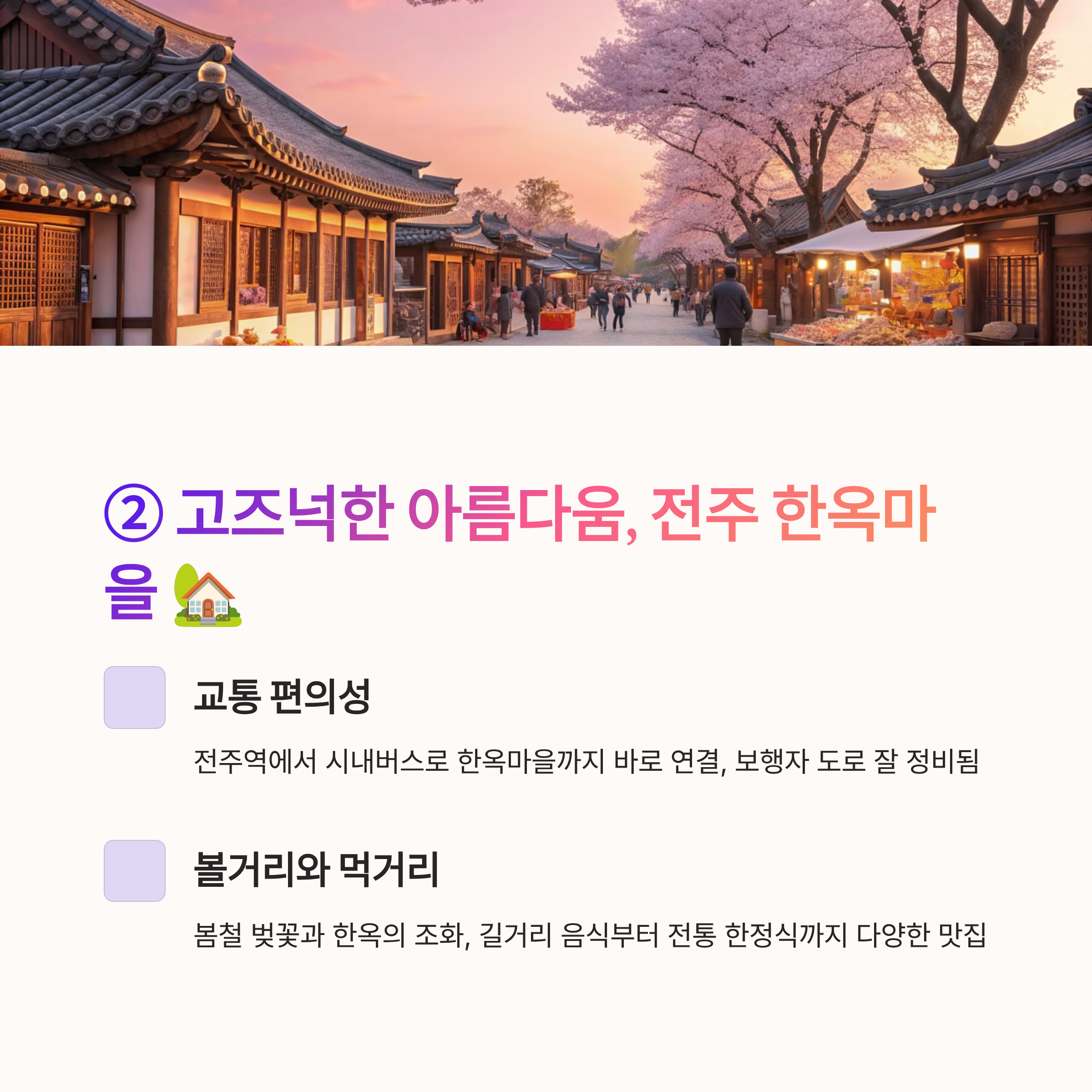 봄에는 한옥 지붕과 함께 흩날리는 벚꽃이 장관을 이루고, 길거리 음식부터 전통 한정식까지 맛있는 음식들이 가득해서 눈과 입이 모두 즐거운 여행이 될 거예요. 한복을 입고 거리를 거닐며 인생 사진을 남기는 재미도 놓칠 수 없겠죠? 😊