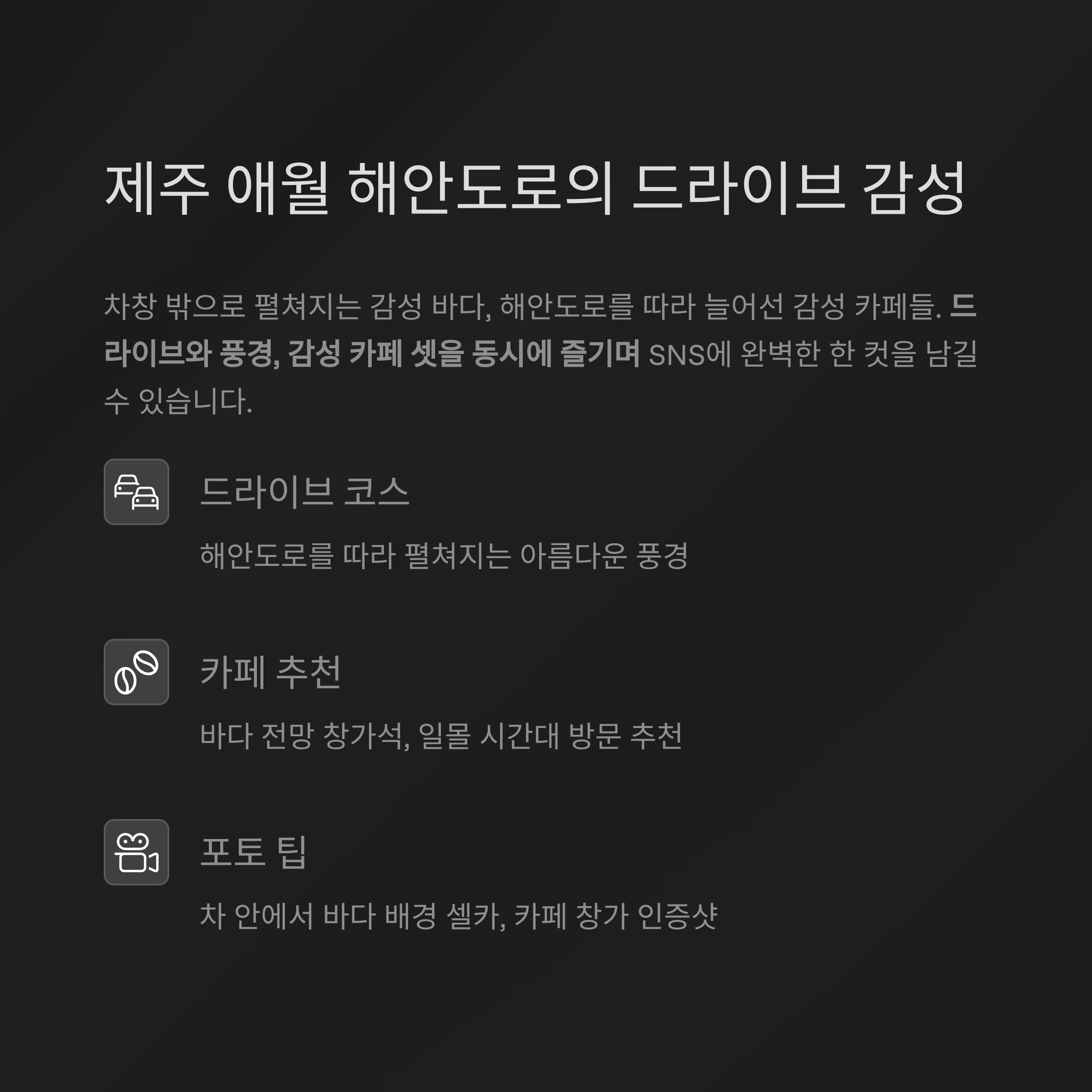 제주 애월 해안도로 – 드라이브와 바다 풍경의 조화