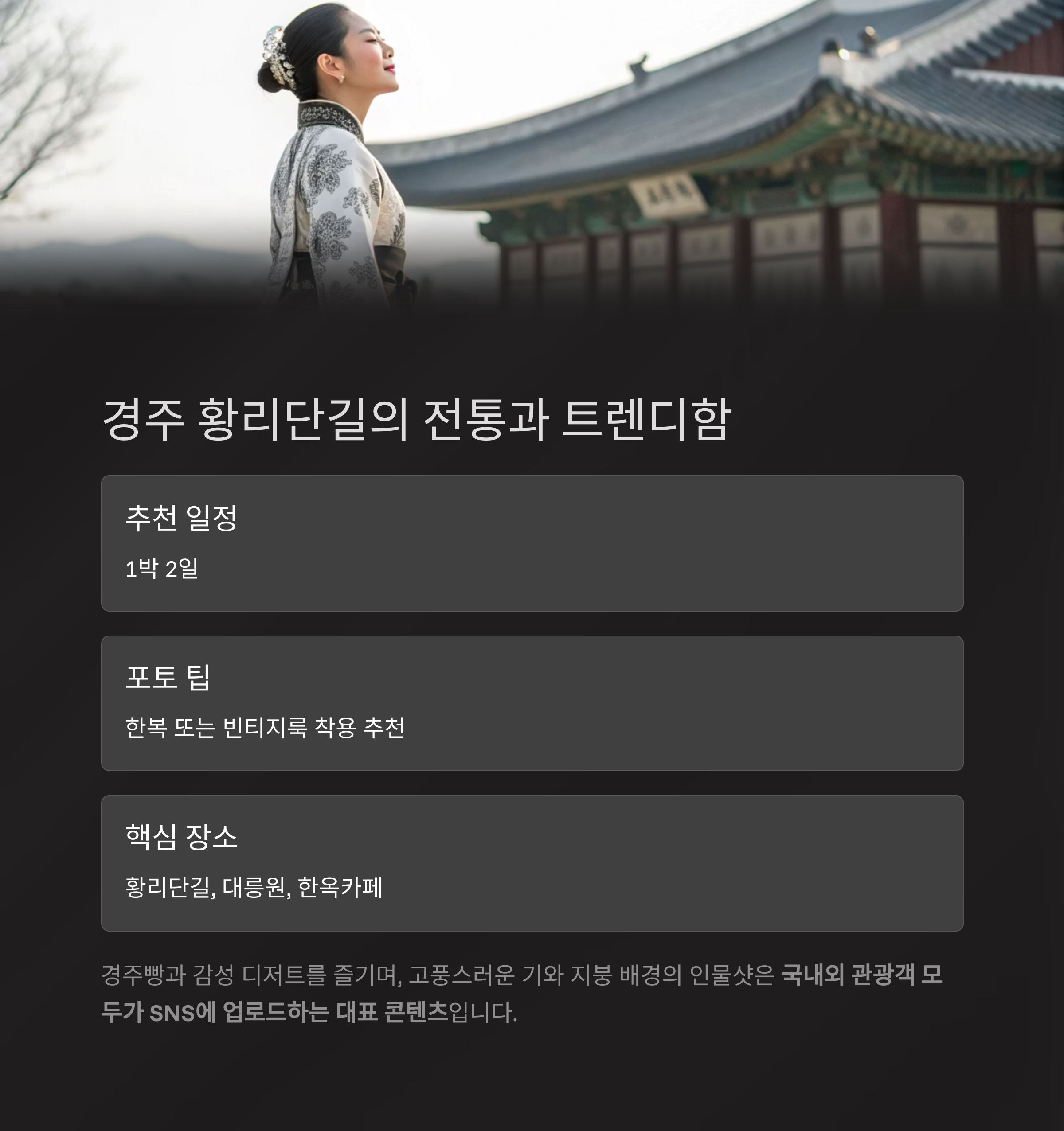 | 핵심 장소 | 황리단길, 대릉원, 한옥카페 |
