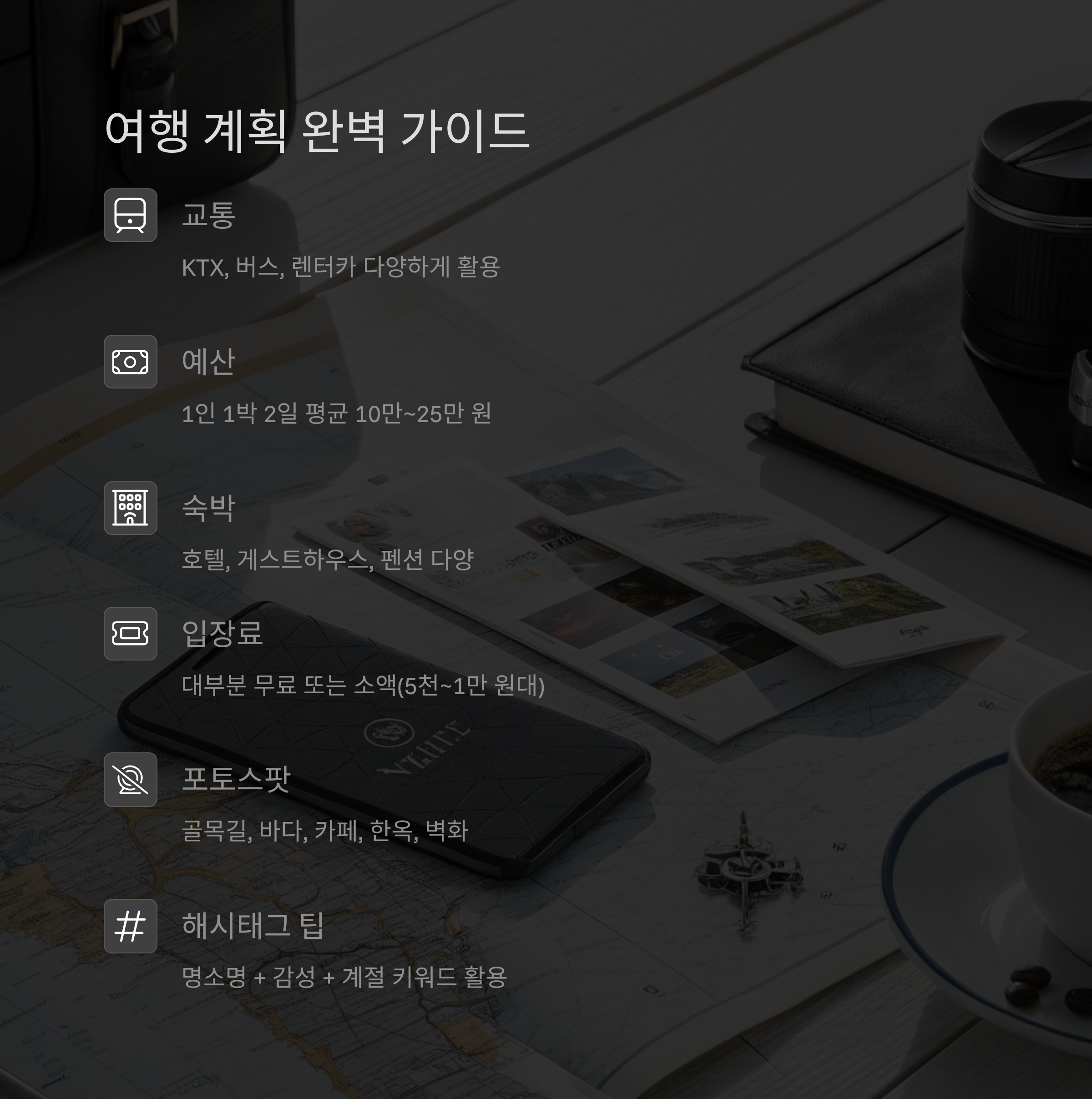 국내 인증샷 명소를 중심으로 교통, 예산, 숙박, 포토스팟까지 모두 안내합니다