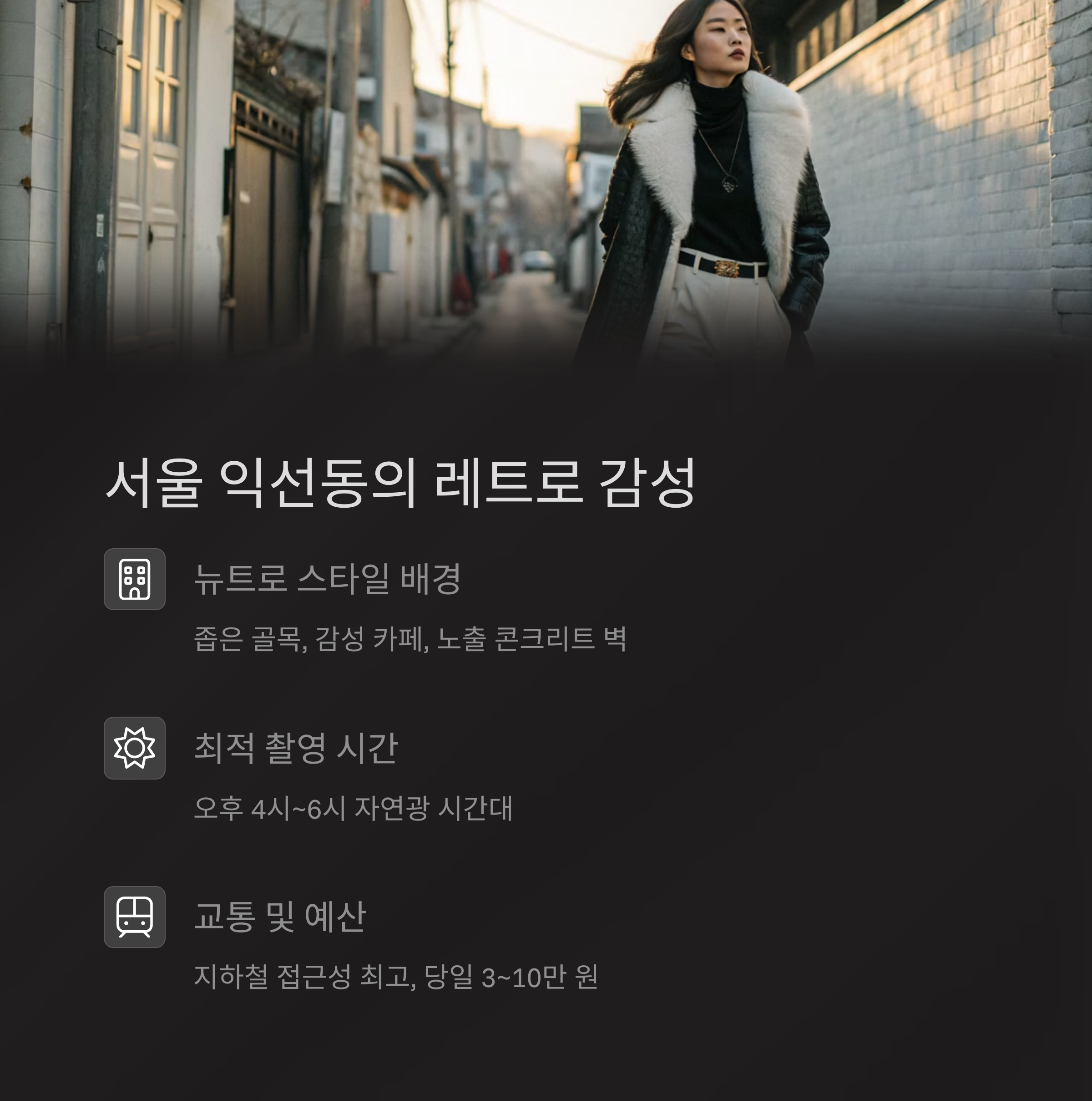 | 대표 사진 스타일 | 골목 + 감성 벽 배경 인물샷 |