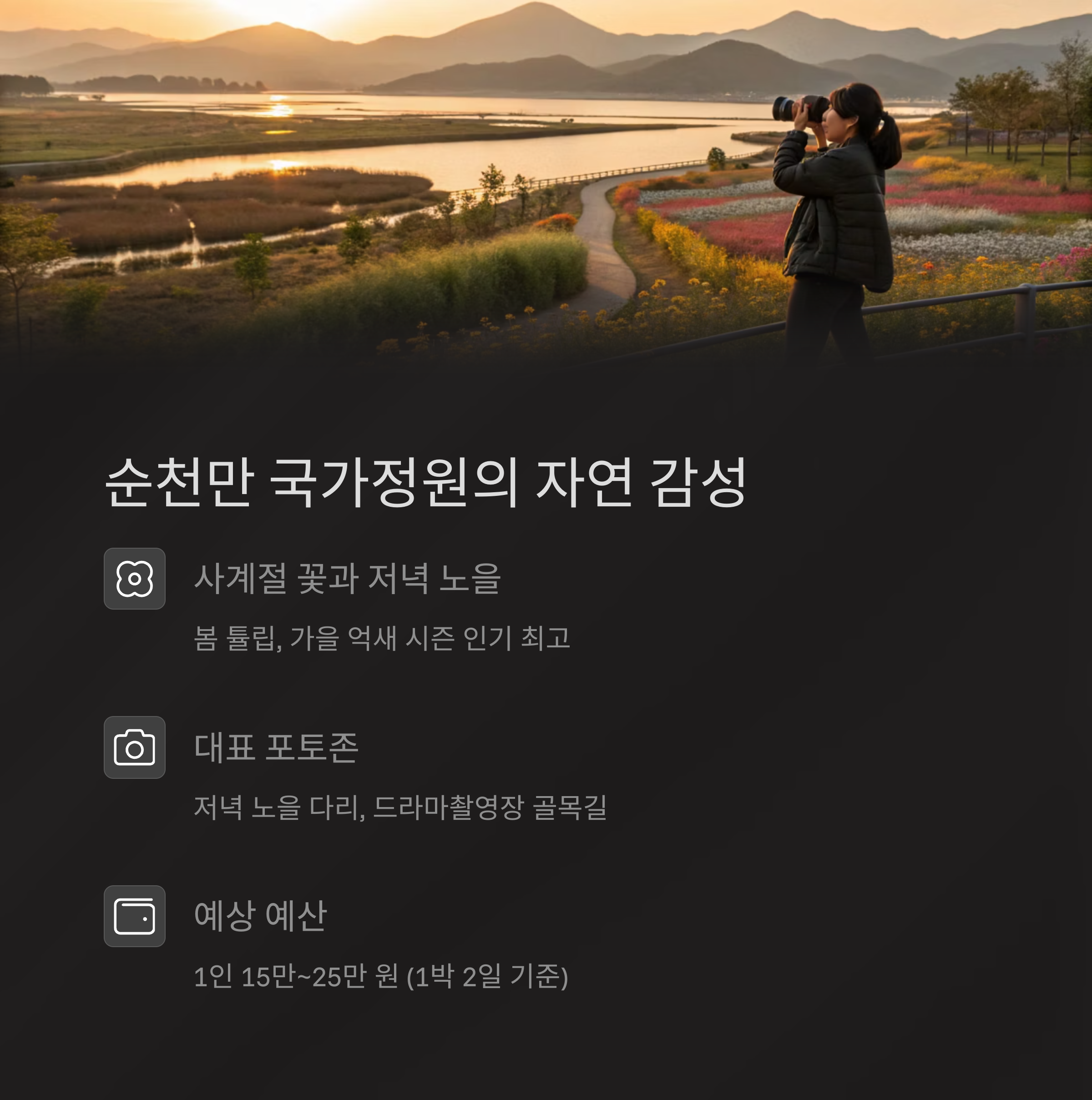 | 계절별 팁 | 봄 꽃, 여름 바다, 가을 단풍, 겨울 설경 |