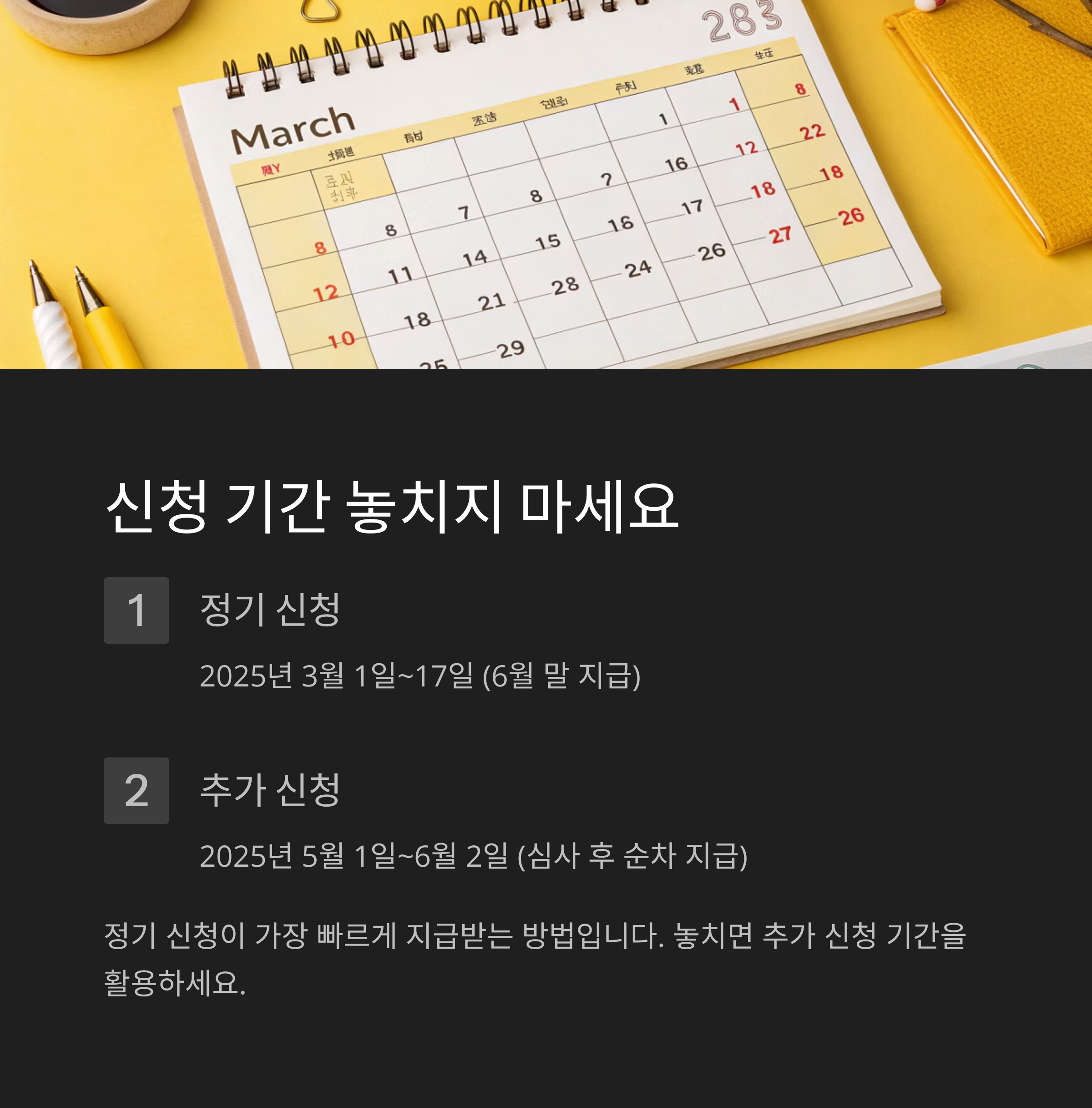 | 신청 기간 | 2025년 3월 1일 ~ 3월 17일 | 2025년 5월 1일 ~ 6월 2일 |