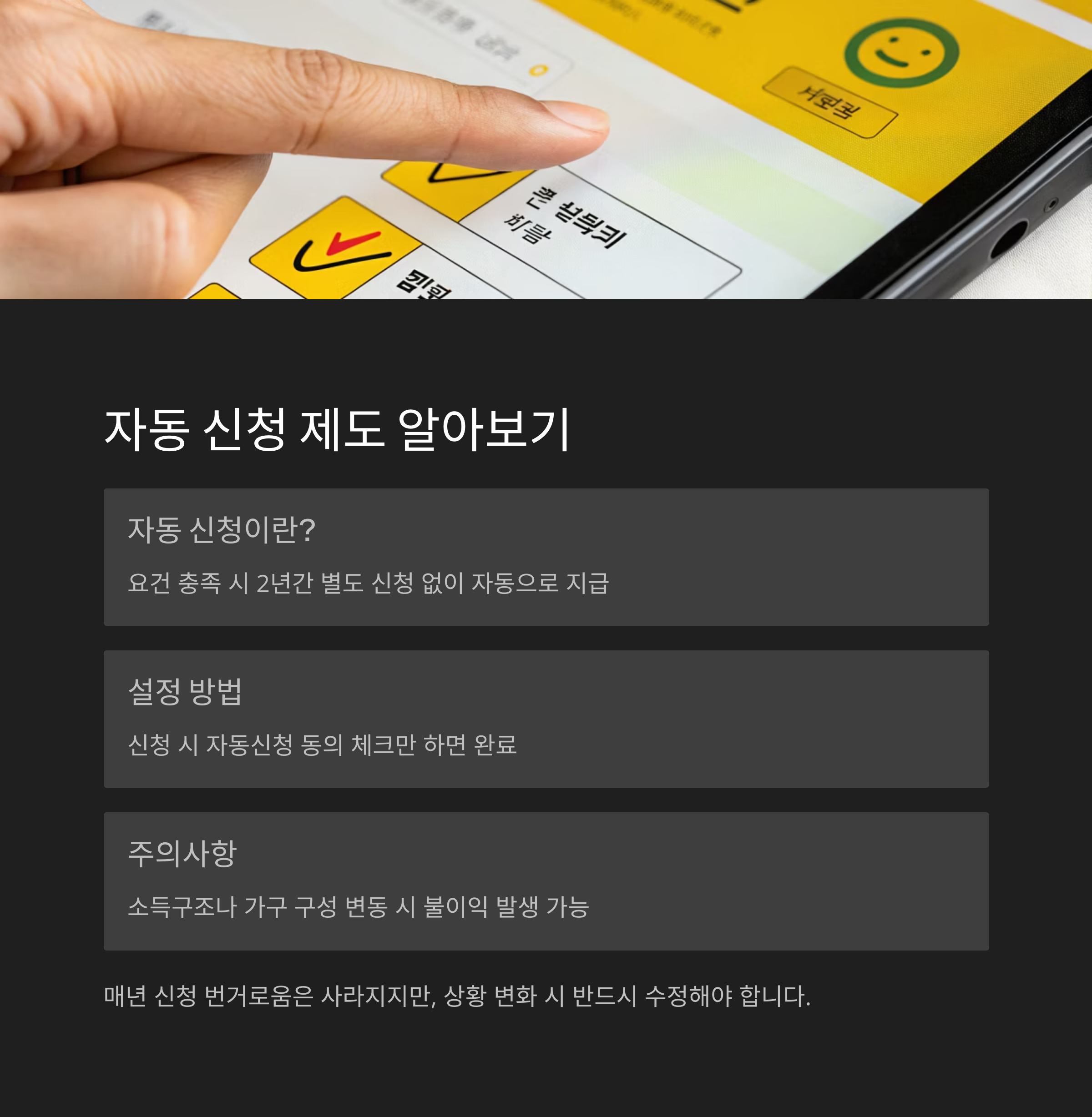 요건 충족 시 2년간 별도 신청 없이 자동으로 지급되는 방식입니다.