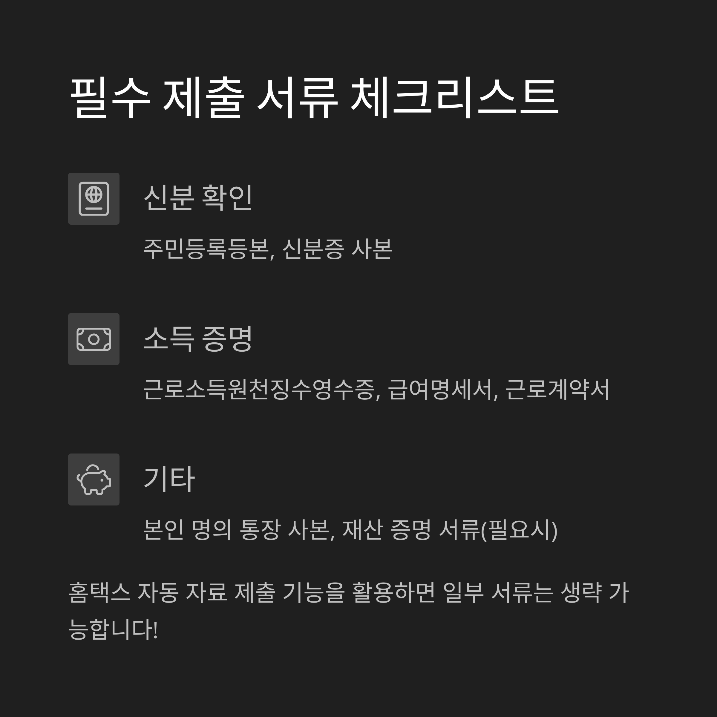 ✔ 홈택스 자동 자료 제출 기능을 활용하면 일부 서류는 생략 가능!