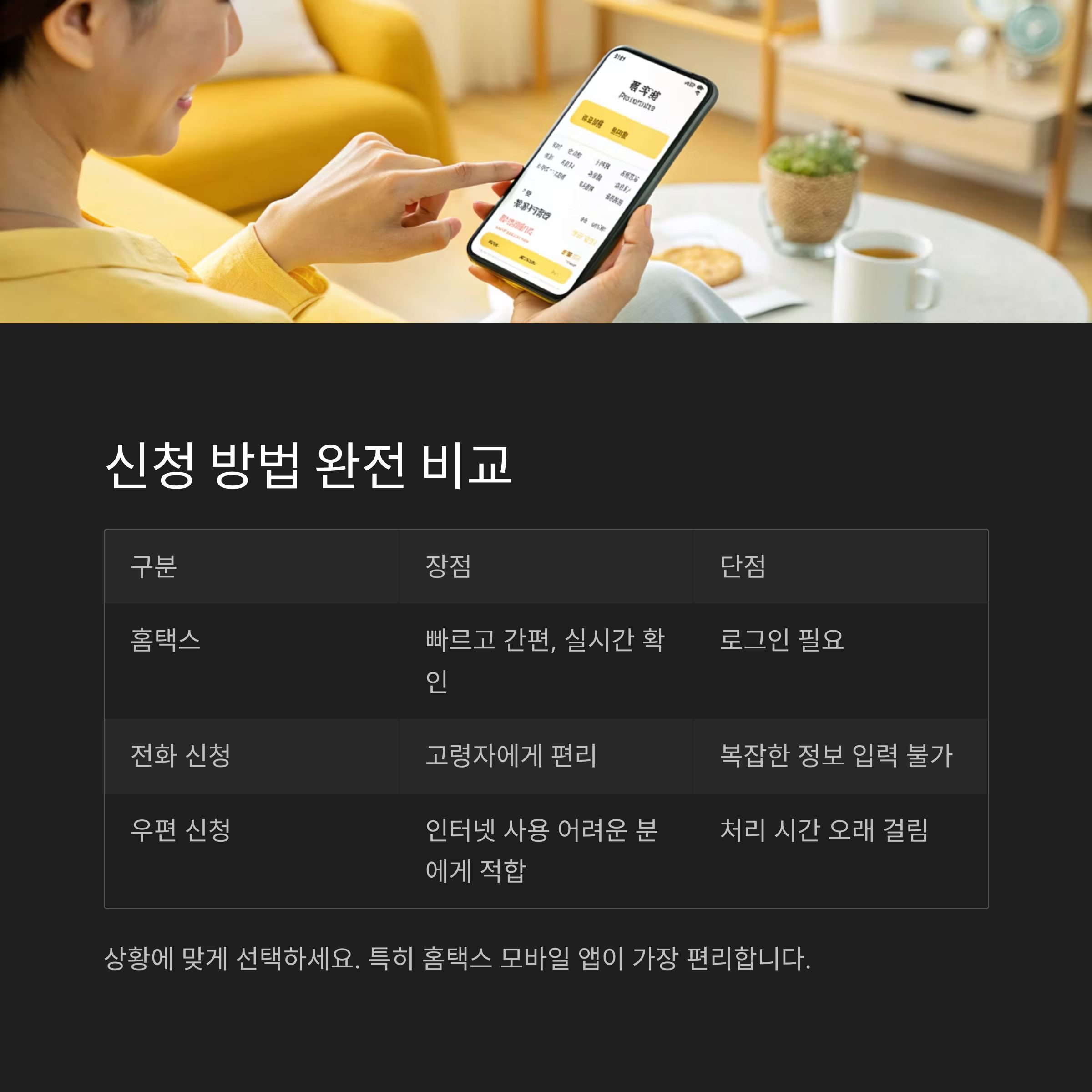 | 전화 신청 | 1544-9944 (1번 ARS) | 고령자에게 편리 | 복잡한 정보 입력 불가 |