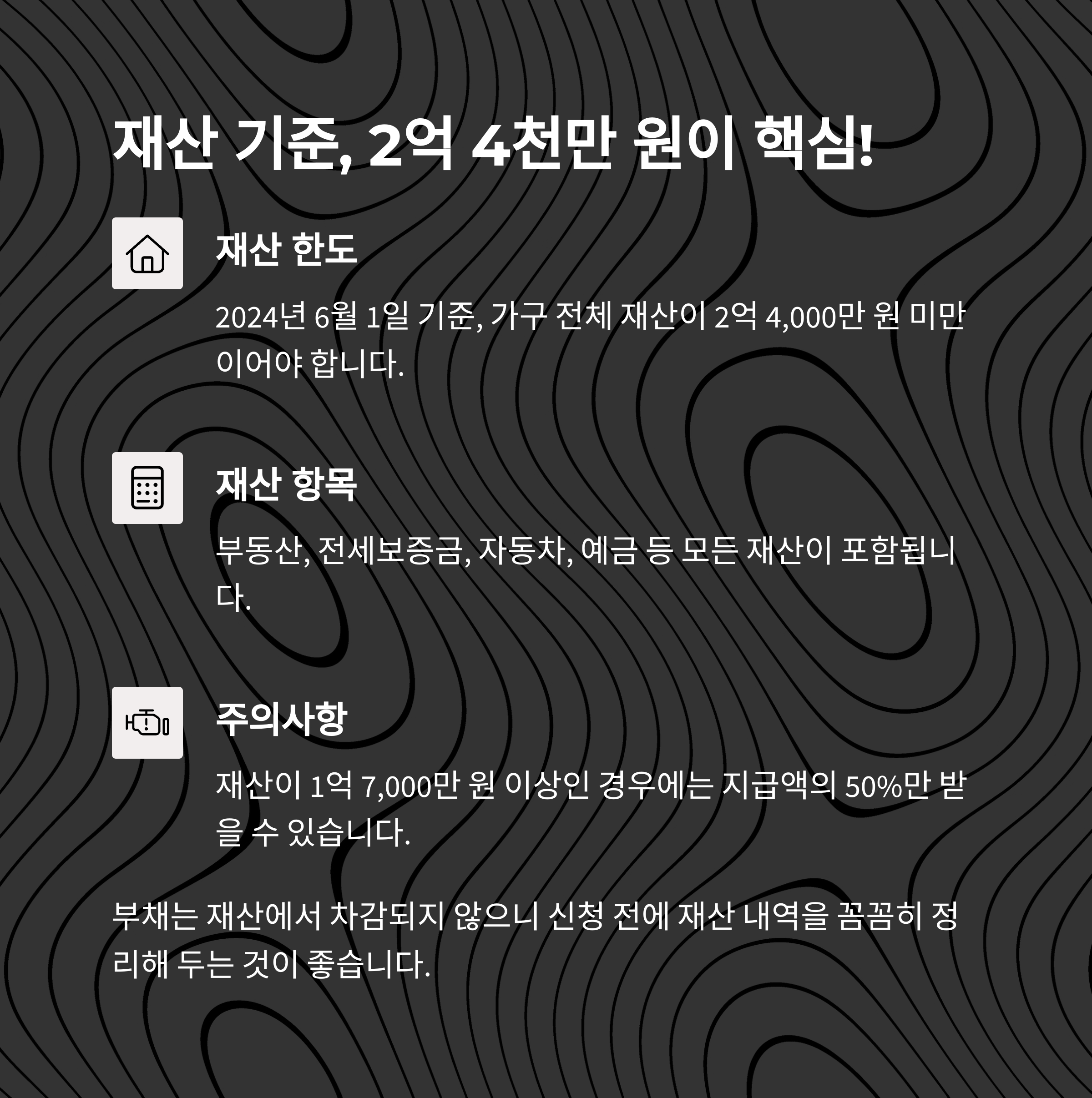 - 2024년 6월 1일 기준, 가구 전체 재산이 2억 4,000만 원 미만