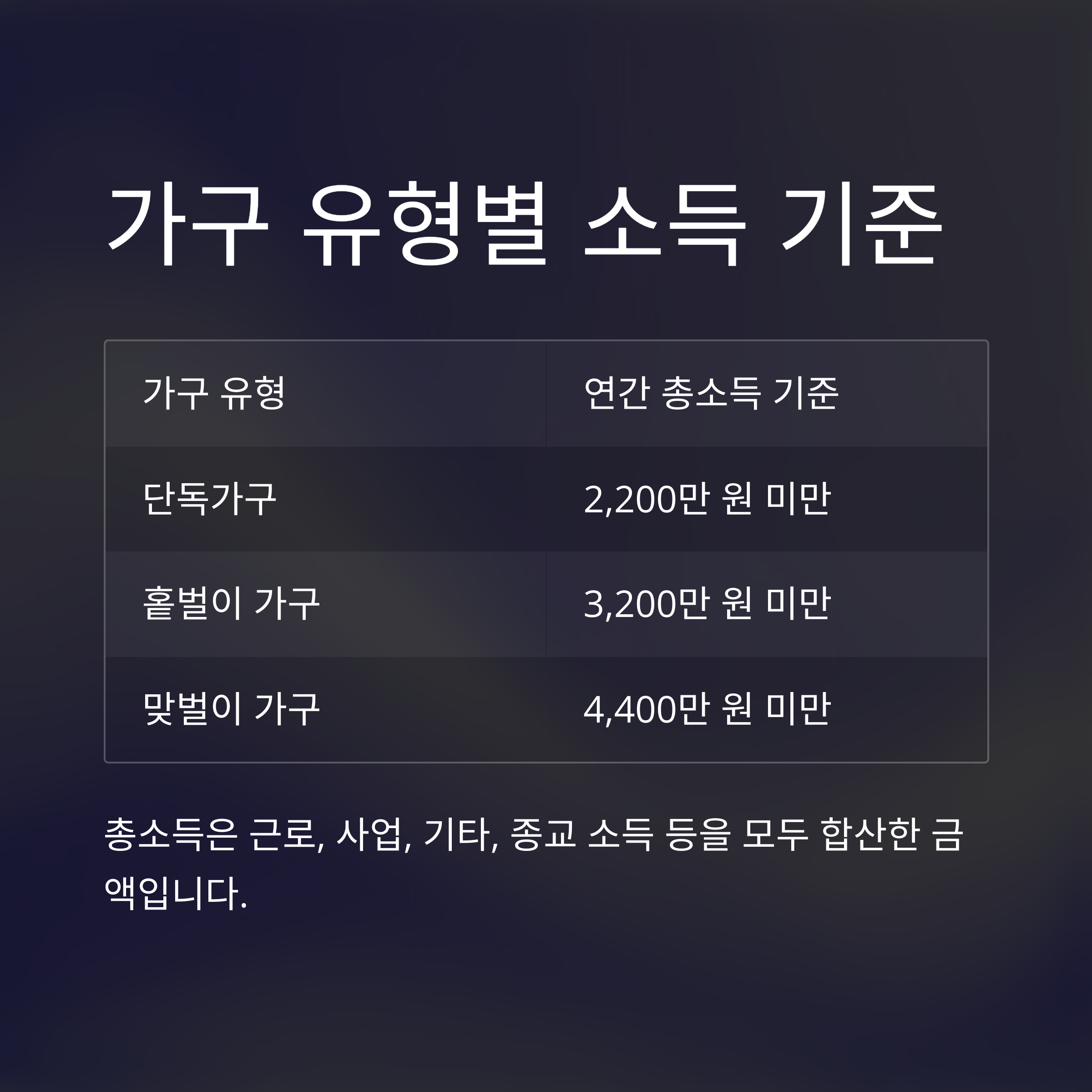 아래 표는 가구 유형별로 2025년 기준 총소득 한도를 정리한 내용입니다.