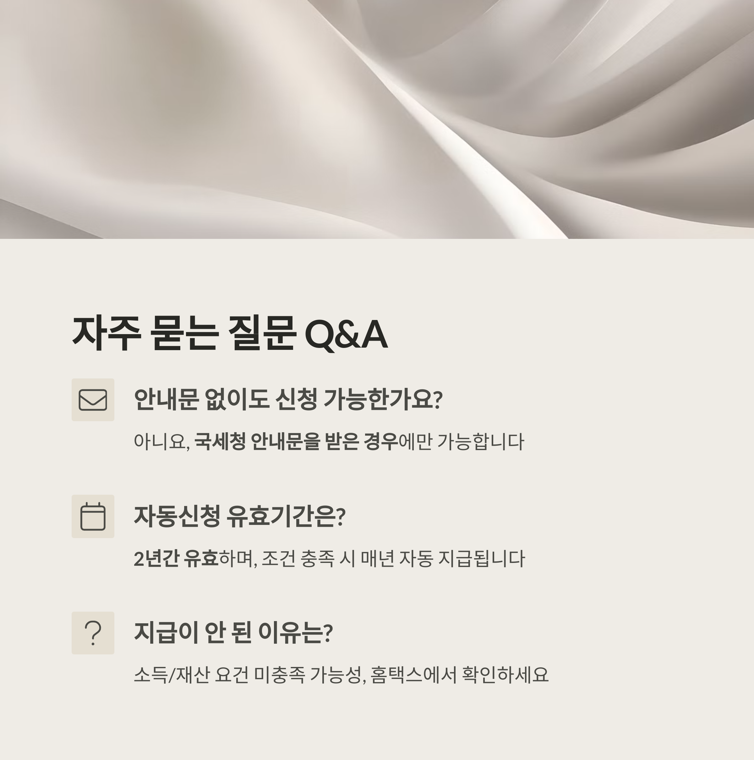 → 네, 자동신청 대상자는 국세청에서 별도 안내문을 받은 경우에만 가능합니다. - Q2: 자동신청하면 다음 해에도 계속 받나요?